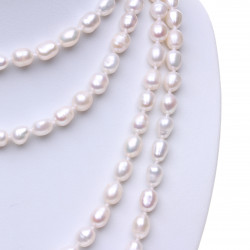 Tento úžasně dlouhý bílý perlový náhrdelník je vyrobený z oválných sladkovodních perel velikosti 6x7-7,5 mm. Perly mají hladký povrch jen vzácně s drobnými nedokonalostmi s vysokým hedvábným leskem. Délka náhrdelníku je 1,50 m. Náhrdelník je zpracovaný klasickou perlovou technikou, perly jsou od sebe oddělené uzlíky. Náhrdelník je vázaný na speciálním zátěžovém nylonu určeném pro perly. Power nylon je zvláště vhodný pro dlouhé perlové šňůry, toto vlákno je oproti klasickému hedvábí odolnější na přetržení. Perly od nás dostanete v dárkové krabičce společně s certifikátem.