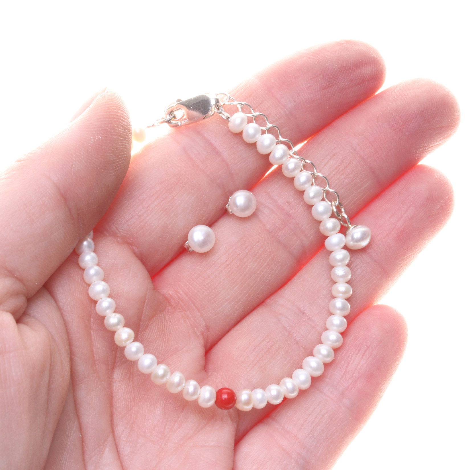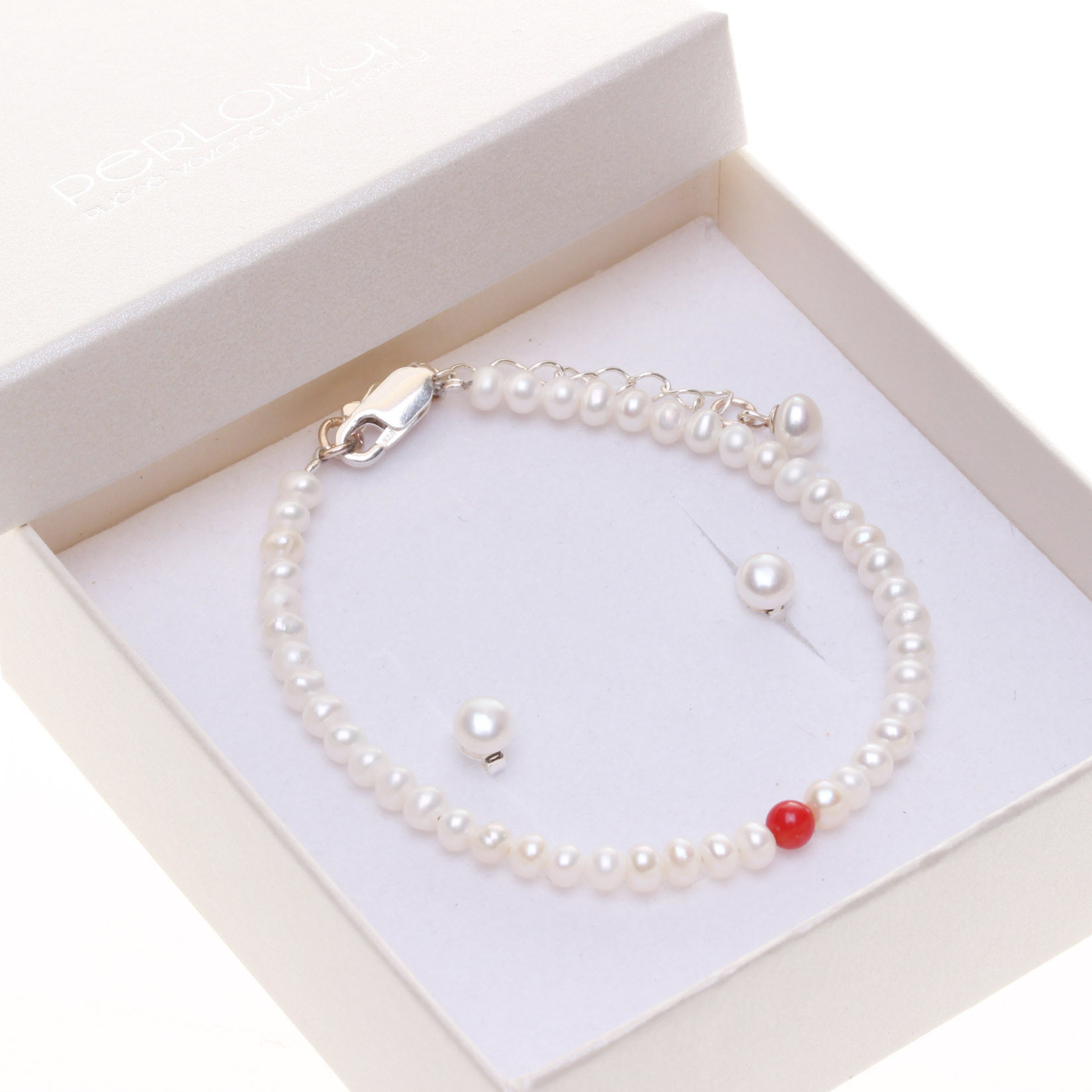 Jemná šperková souprava z bílých sladkovodních perel je oživena drobným akcentem červeného korálu. Kontrast mezi čistou bílou a teplým tónem korálu dodává šperku lehkost i energii, aniž by ztrácel svou eleganci.