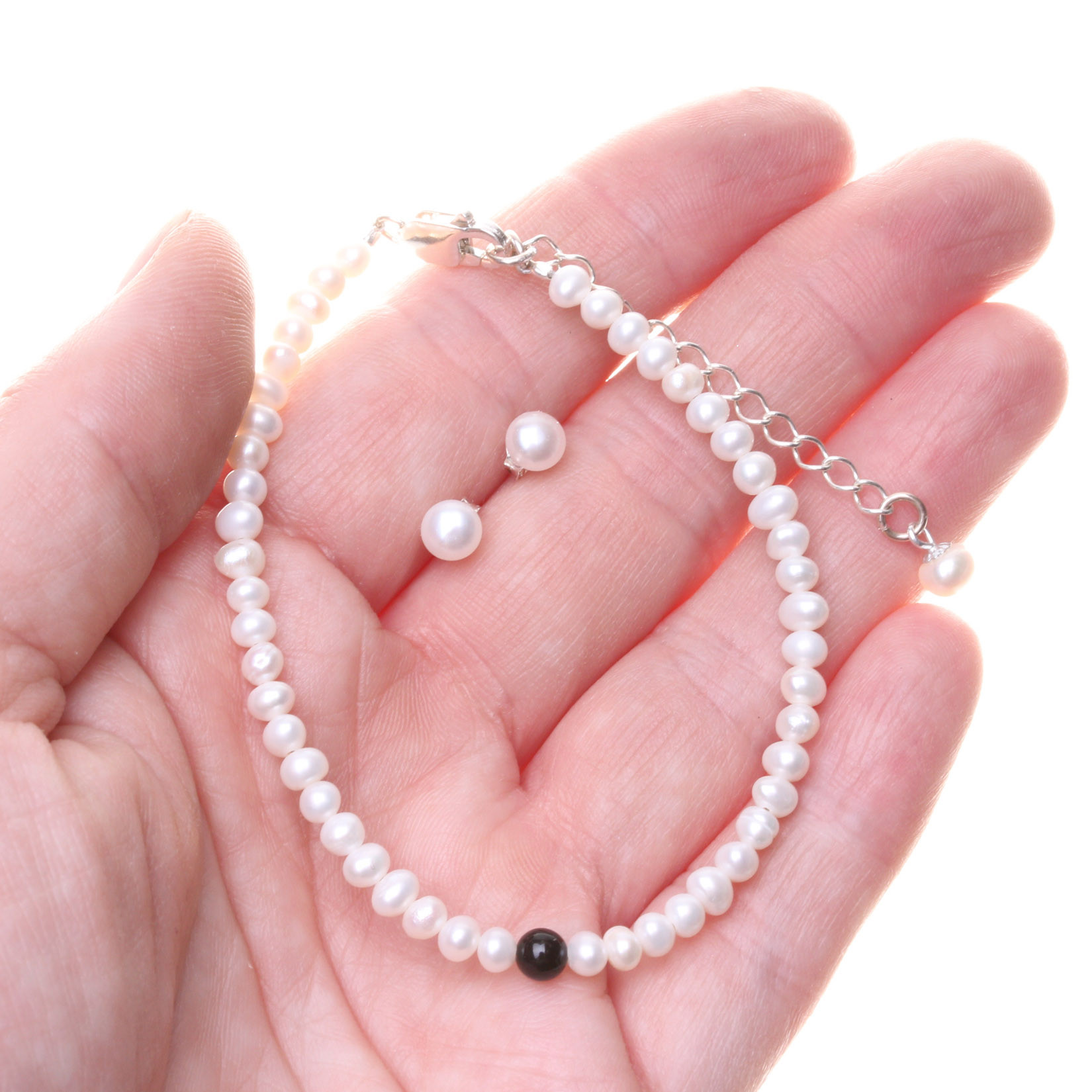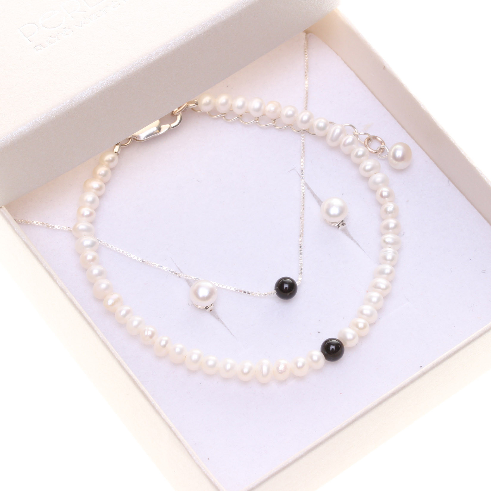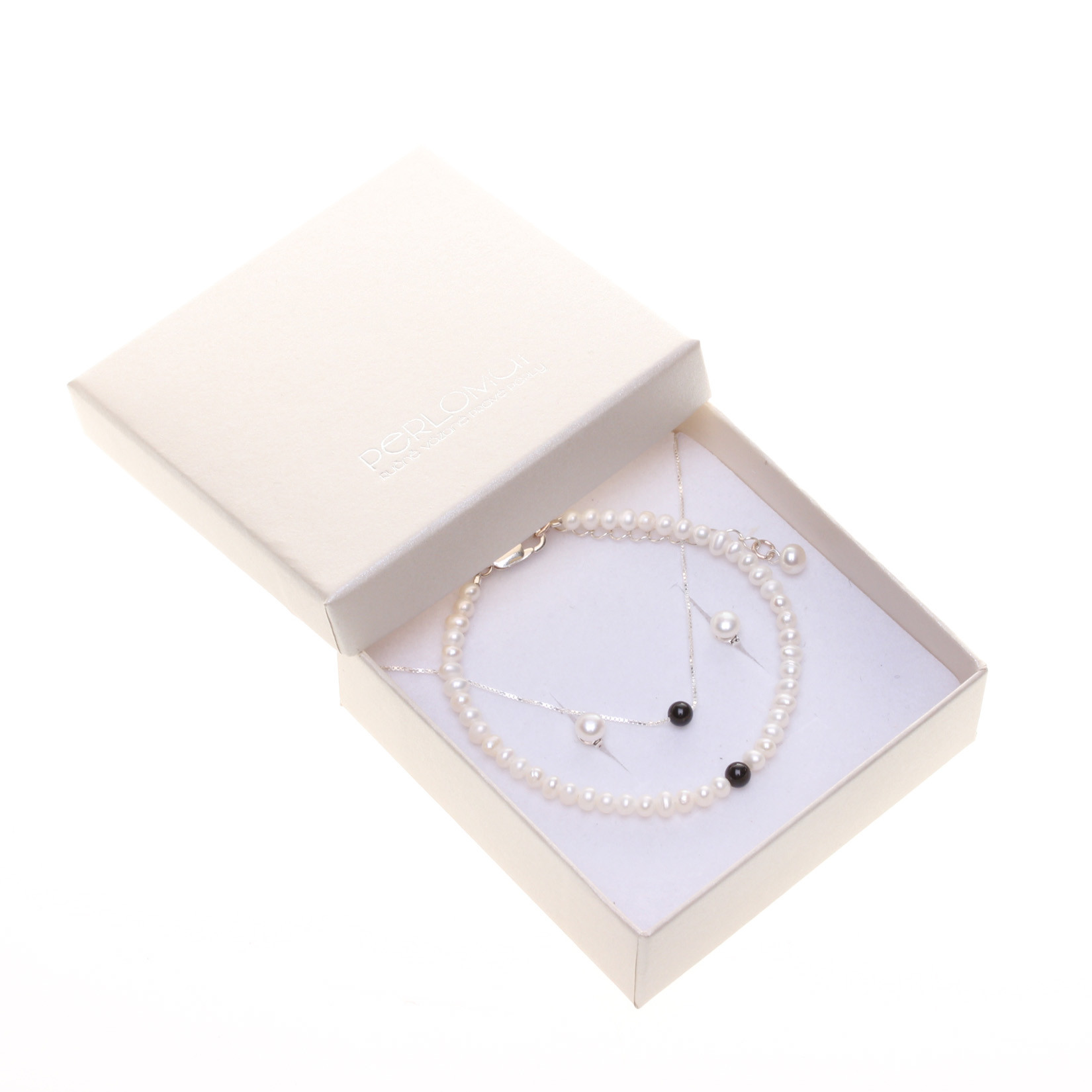Jemná šperková trojdílná souprava z bílých sladkovodních perel je oživena drobným akcentem černého onyxu. Kontrast mezi čistou bílou a kontrastní černou dodává šperku výraz i energii, aniž by ztrácel svou eleganci.