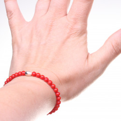 Červený korálový náramek je vyrobený z hladkých kuliček přírodního dobarvovaného korálu o průměru 4,5 mm. Ve středu náramku je osazen stříbrný oválný korálek. Délka náramku je 18 cm. Tento náramek je vhodný pro zápěstí cca 14-16 cm, (dámská vel. 36-38). Náramek je navlečen na pružence.