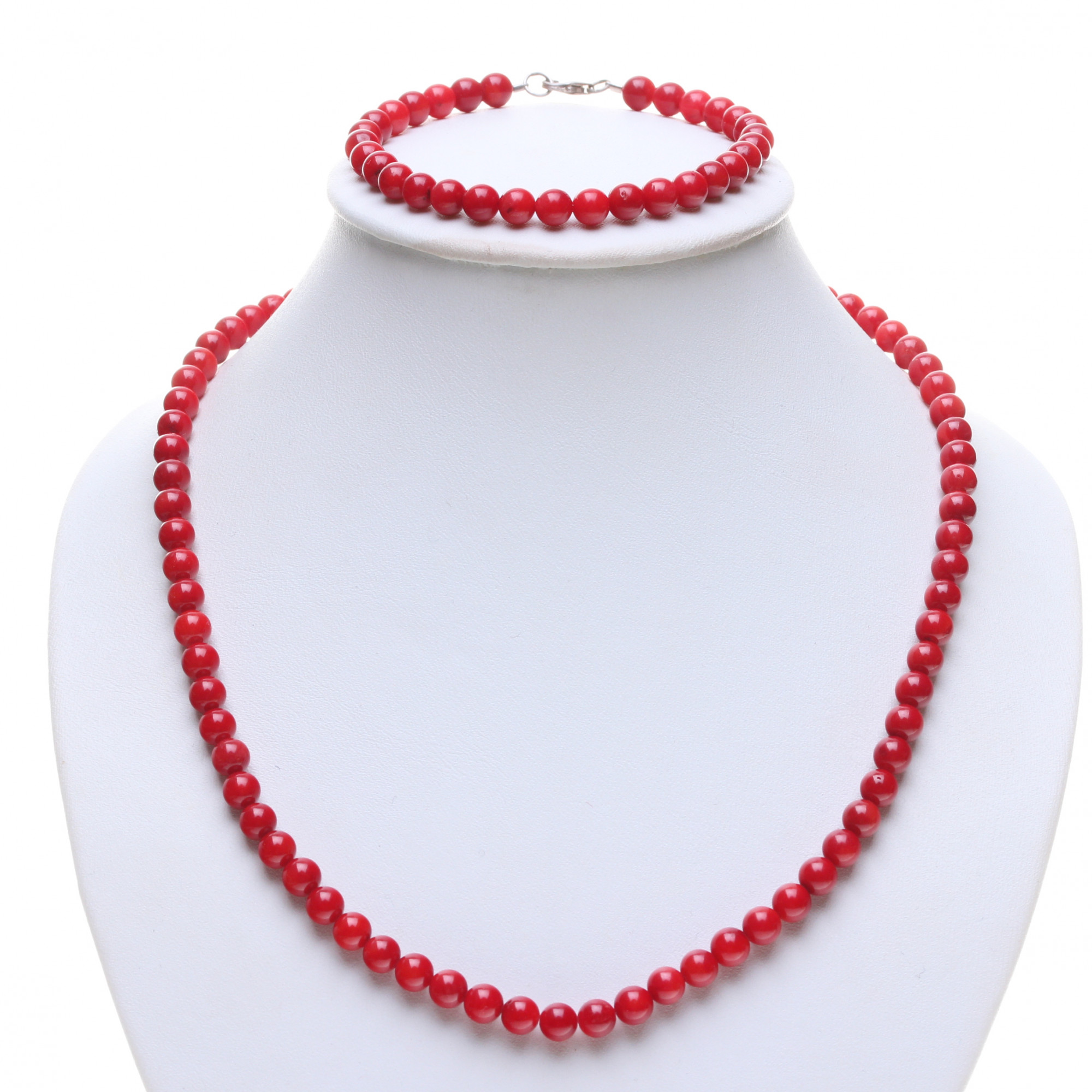 Korálová souprava je tvořená náhrdelníkem a náramkem z přírodních korálů. Korály v náhrdelníku a v náramku jsou kulaté, hladké o průměru 5 mm. Korály jsou navlečené na chráněném ocelovém lanku. Šňůry v náhrdelníku i náramku bezpečně drží a hezky nesou oblý tvar. Délky šperků jsou 41/45 a 18/19 cm. K soupravě máme v nabídce na doplnění také náušnice na puzetu, šroubek nebo visací náušnice na klapací patent.