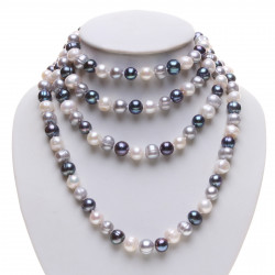 Tento dlouhý perlový náhrdelník je vyrobený z bílých, šedých a černých sladkovodních perel o velikosti 8-9 mm. Délka náhrdelníku je 130 cm. Perly mají krásný lesk. Celý náhrdelník je ručně uzlíkovaný na dvojité zátěžové niti. Jednotlivé perly jsou oddělené jedna od druhé uzlíky. Je tak zabráněno jejich odírání a v případě přetržení šňůry se vám perly nerozkutálejí. Orientačním hmotnost šperku je 110 gramů. Perly od nás dostanete v dárkovém balení společně s naším certifikátem původu perel.