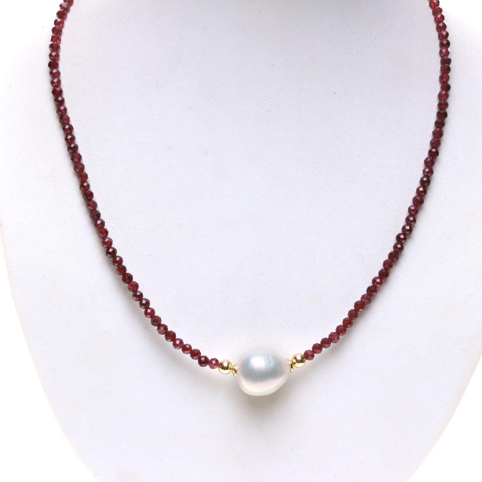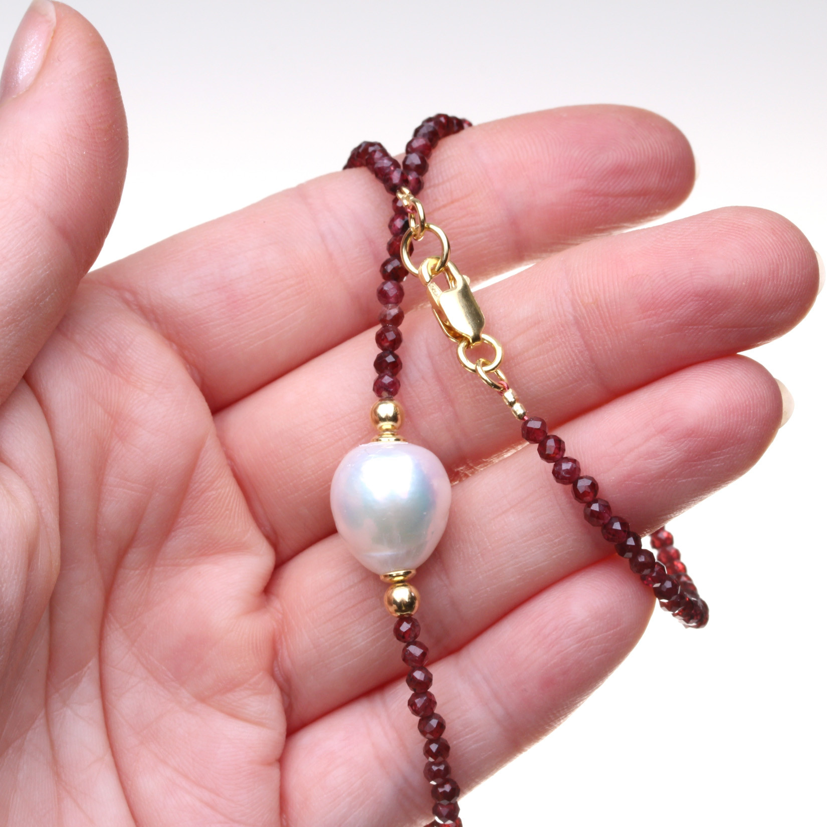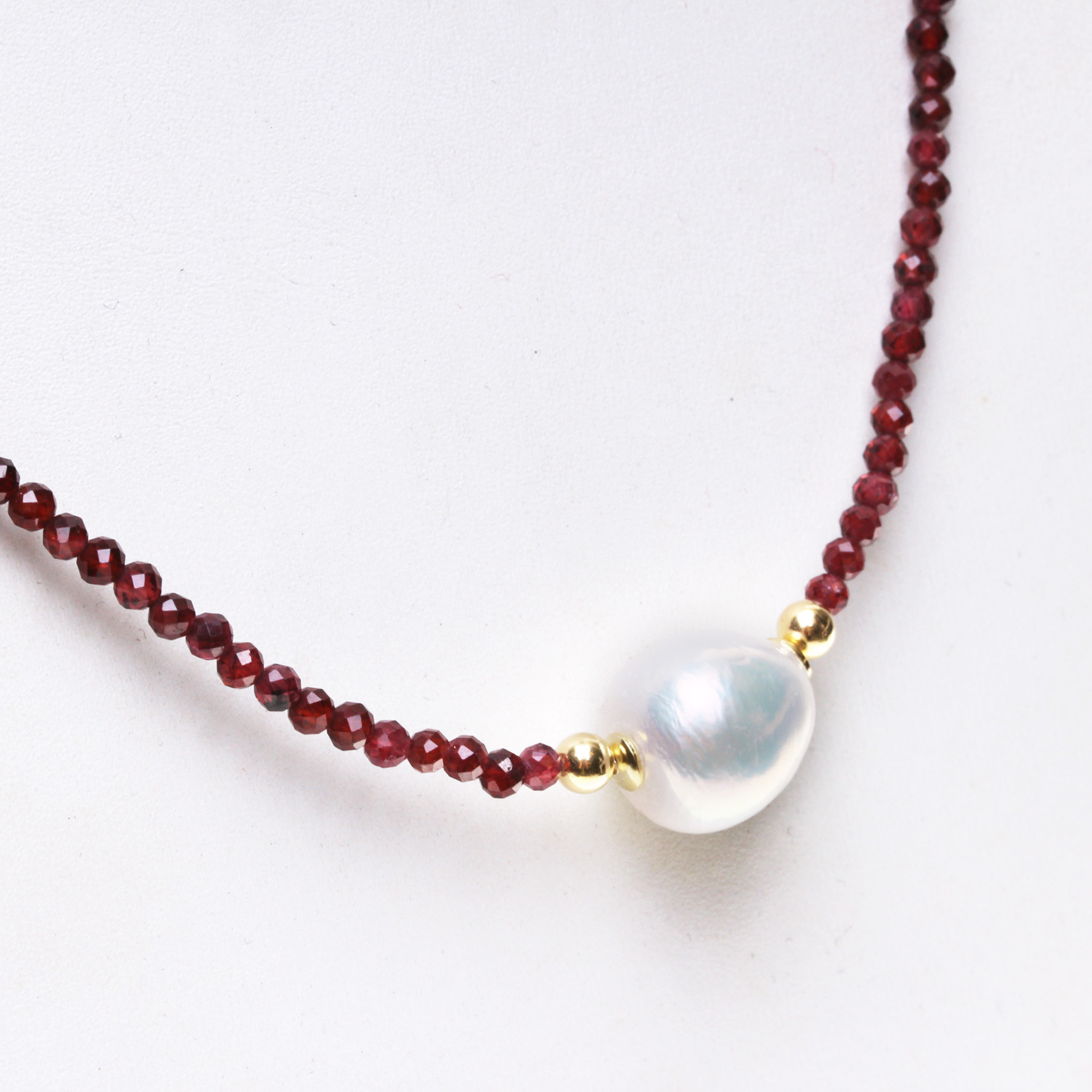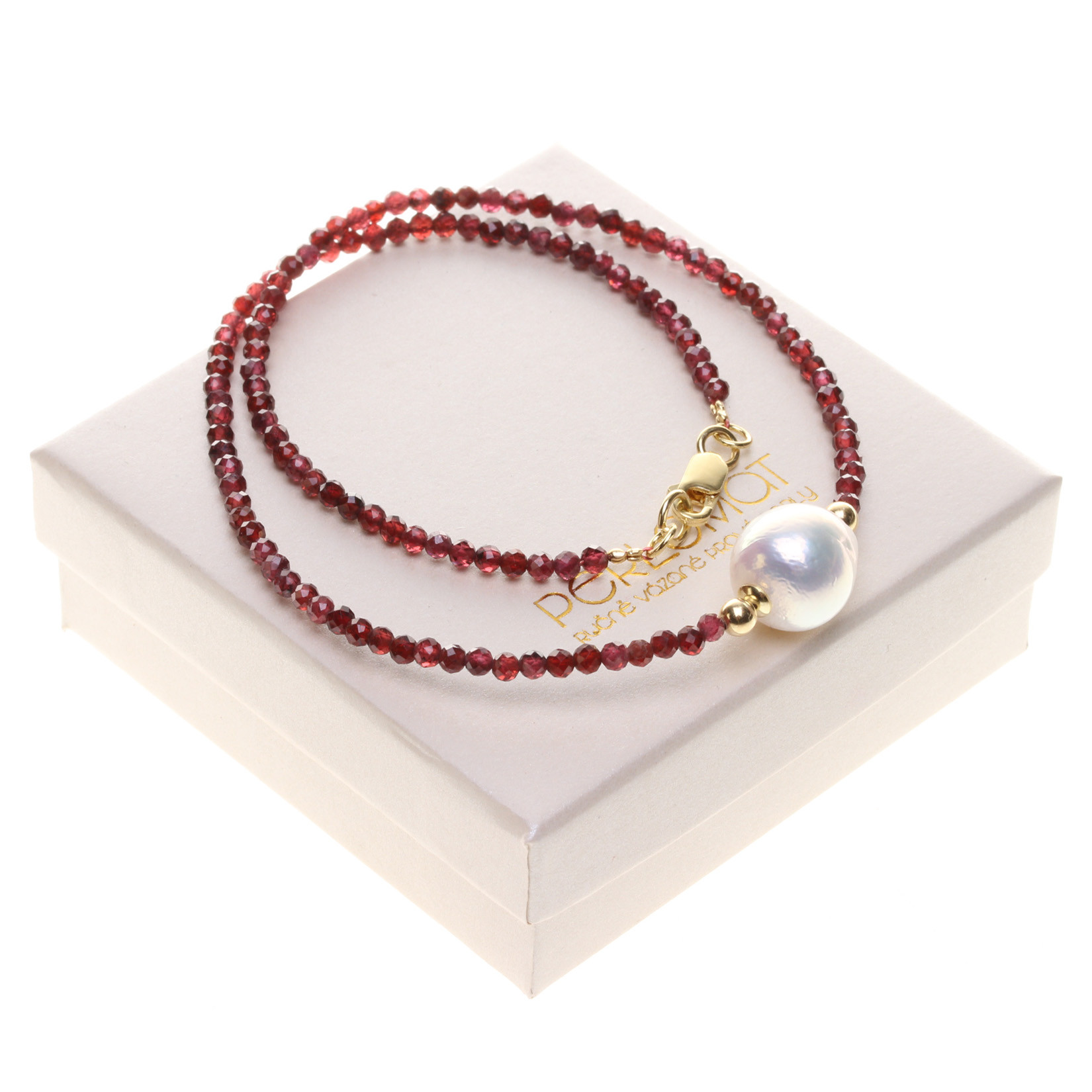 Ručně navlečený náhrdelník z drobných fazetovaných granátků v sytě vínovém odstínu, doplněný výraznou přírodní perlou Kasumi. Šperk působí velmi jemně, ženský a přesto výjimečný – ideální pro ženy, které preferují decentní, avšak luxusní doplňky.