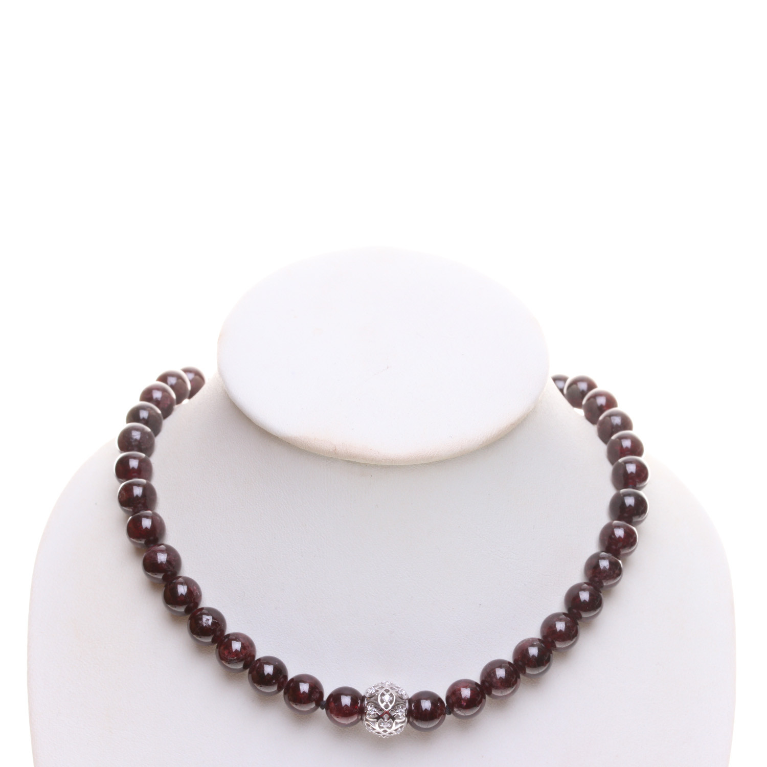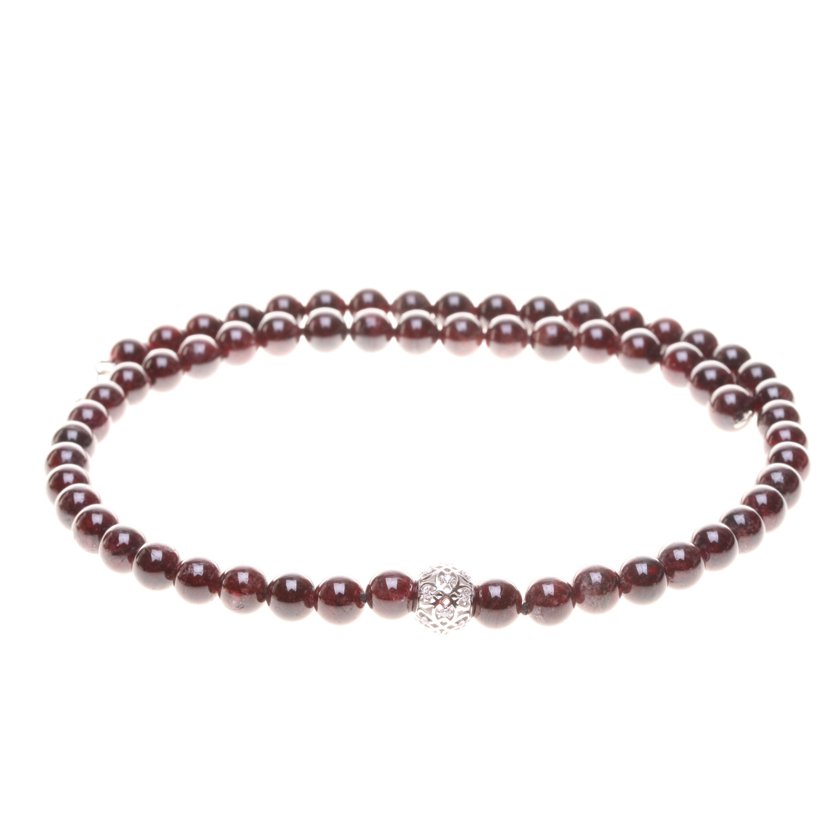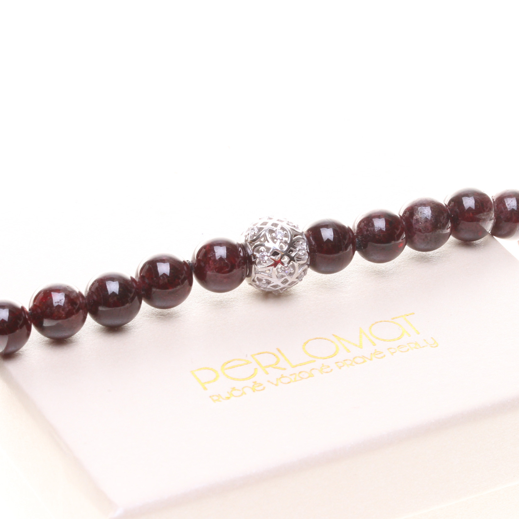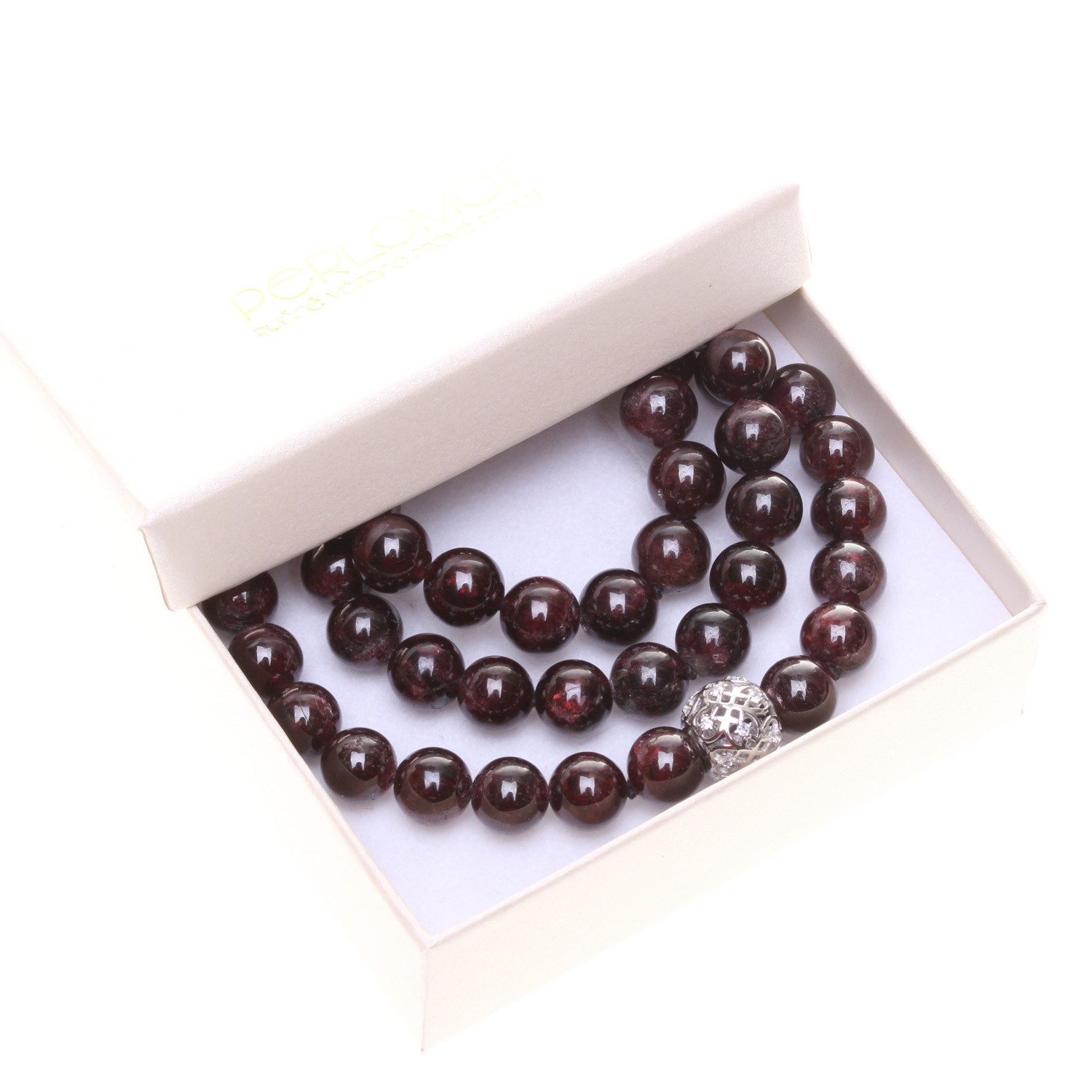 Klasická elegance v moderním provedení: tento náhrdelník je tvořen přírodními granáty o průměru 8 mm, jejichž temně vínový odstín působí hluboce a sofistikovaně. Každý kámen je ručně navázán na hedvábnou šňůru, což dodává šperku jemnost, lehkost a splývavost. Uprostřed náhrdelníku je osazena rhodinovaná stříbrná kulička (Ag 925) s jemně filigránovým dekorem, která celý šperk elegantně rozjasňuje.