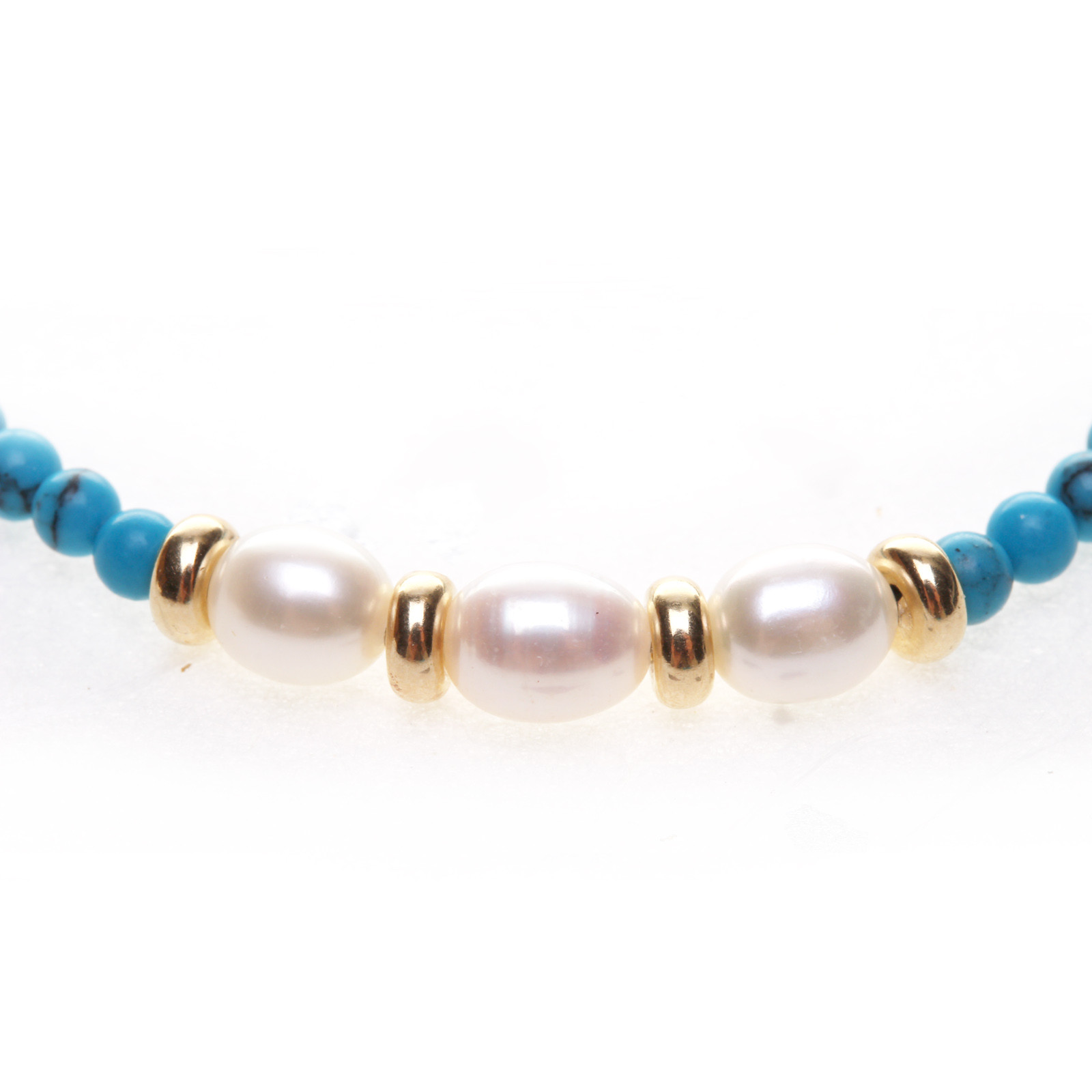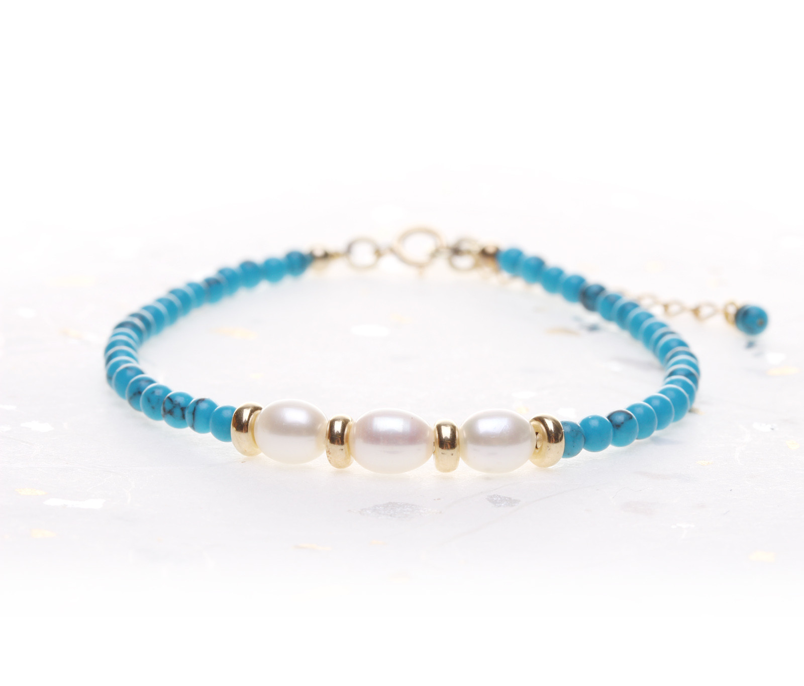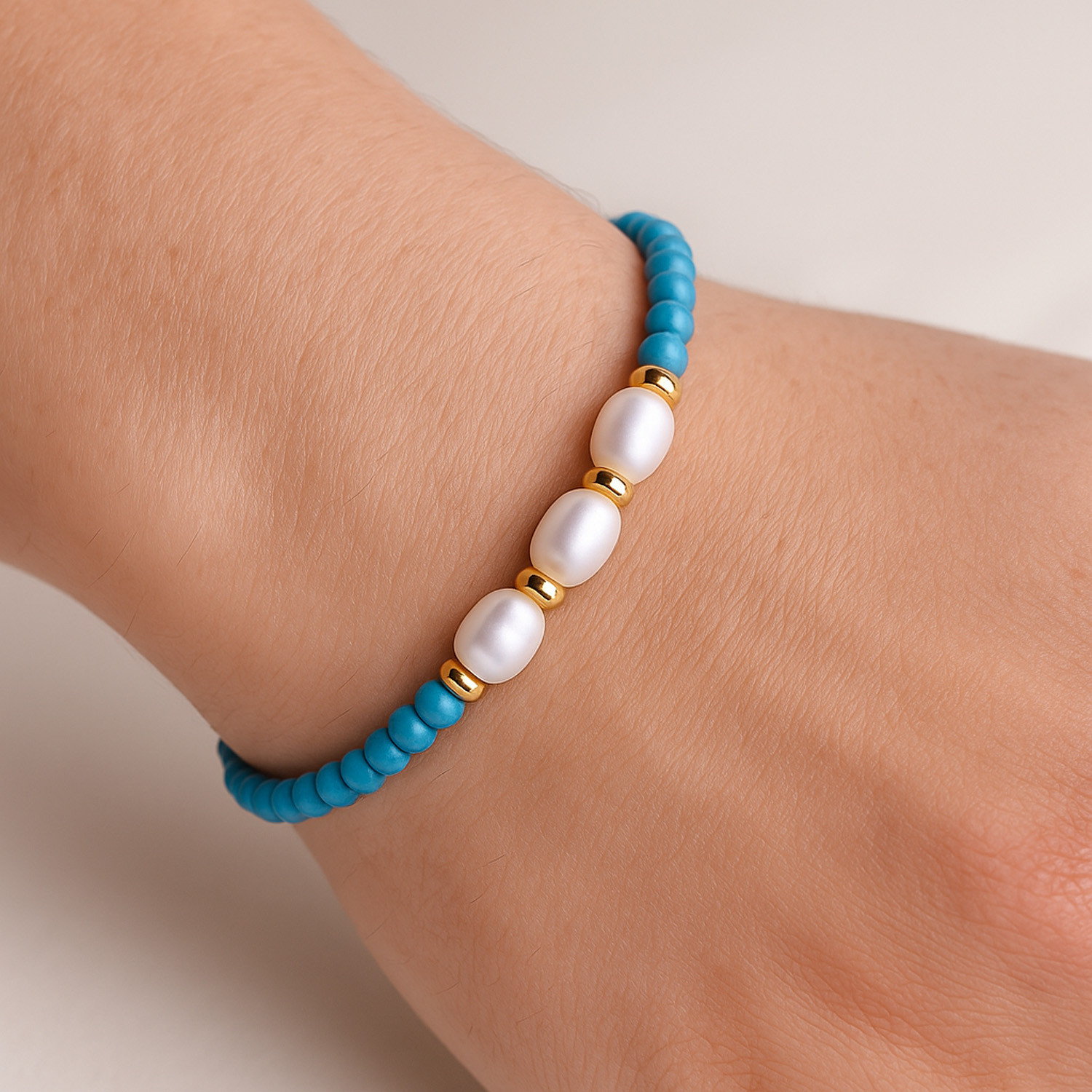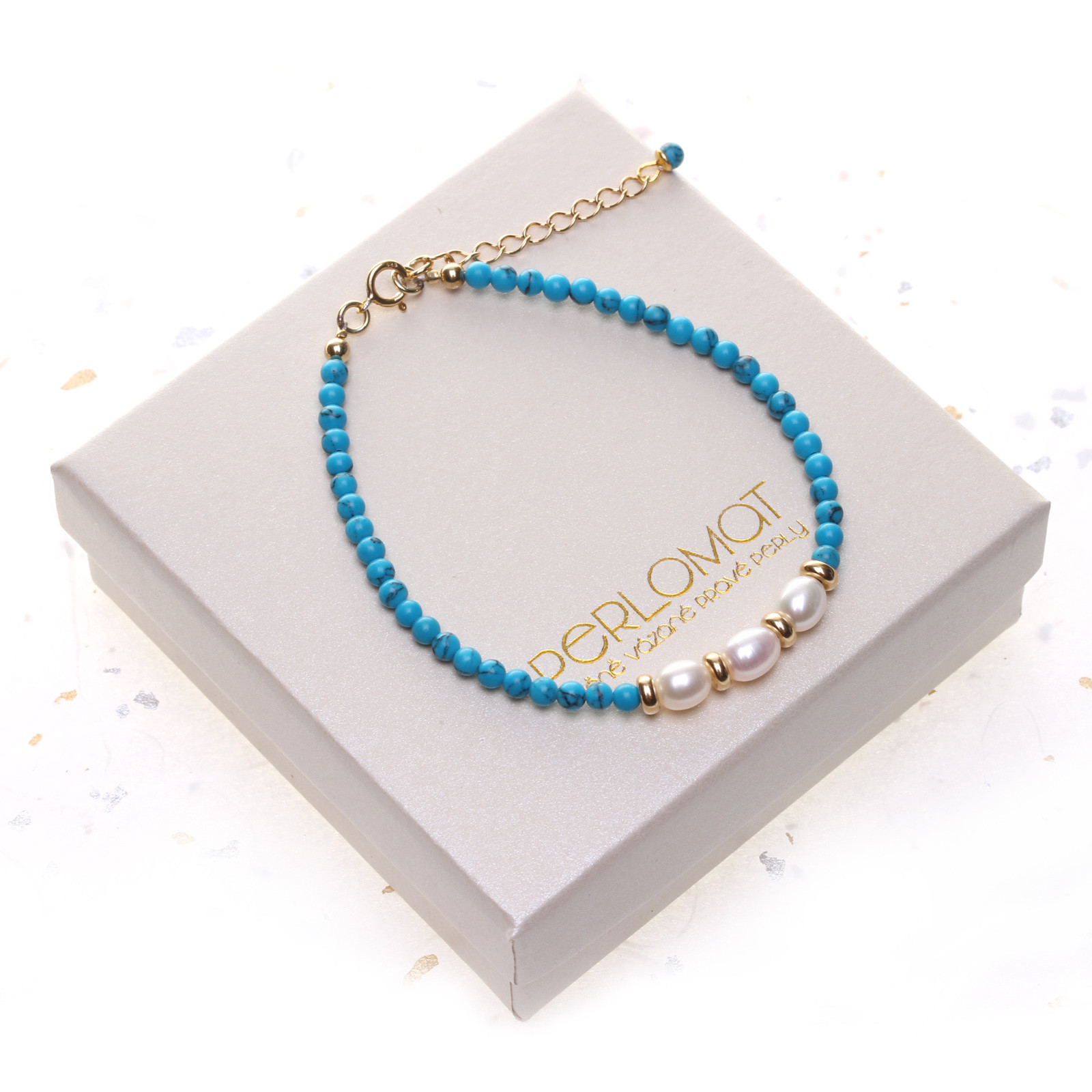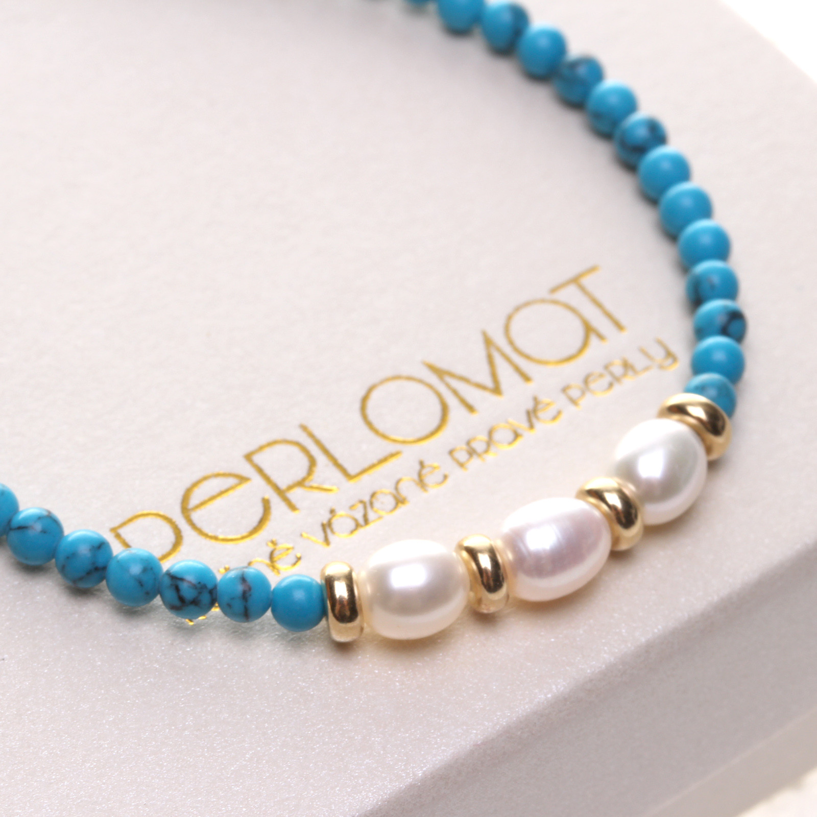 Elegantní náramek ručně sestavený z jemných tyrkysových korálků o průměru 3–4 mm, doplněný třemi sladkovodními perlami, které jsou zvýrazněny zlacenými stříbrnými rondelkami. Spojení modrého tyrkysu a perel působí svěže, nadčasově a luxusně zároveň. Tento náramek je ideální jako samostatný šperk i jako součást sady s náhrdelníkem a náušnicemi z kolekce Celeste, kterou najdete v sekci drahé kameny - soupravy.