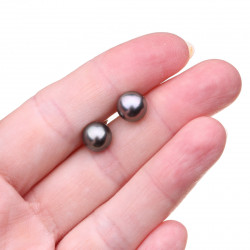 Pár krásných tmavých perlových náušnic je osazený dvojicí tahitských perel o velikosti 9,5-10 mm. Perly pocházejí z francouzské polynésie jsou přirozeně černé, téměř ideálně kulaté a hladké, jakost perel je A dle tahitské stupnice. Tl. perleti je min. 0,9-1 mm. Perly jsou polovrtané osazené na puzety s miskou pod perlou. Materiál je montáže je 14 karátové bílé zlato ryzosti 585/1000.