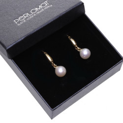 Zlaté perlové náušnice s perlami akoya jsou jemné a elegantní. Do náušnic jsou osazeny mořské akoya perly pocházející z japonských moří o velikosti perly 7 mm a jakosti AA. Síla perleti je min. 0,2 -0,3 mm. Krása těchto perel spočívá v jejich souměrnosti, vysoké bělosti a zejména v nezaměnitelném lesku hrajícím odstíny do lehce růžové. Náušnice jsou vyrobeny ze zlata ryzosti 585/1000. Použitá klapací mechanika je zdobená klenutou kapkou, patent je pohodlný a bezpečný. Celková hmotnost náušnic je 2,25 gr. Vnitřní průměr mechaniky je 10,7 mm. Celková délka náušnic je 25 mm.