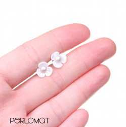 Romantické perleťové květinky - náušnice jsou vyřezávané z přírodní bílé perleti. Květy jsou nasazeny na stříbrný dřík s krempou a vybavené stříbrnou puzetkou. Velikost květu je 10 mm, bílá button perlička má průměr 3 mm. Hmotnost páru náušnic je 1,05 gramu. Náušnice obdržíte v dárkovém balení s certifikátem původu.