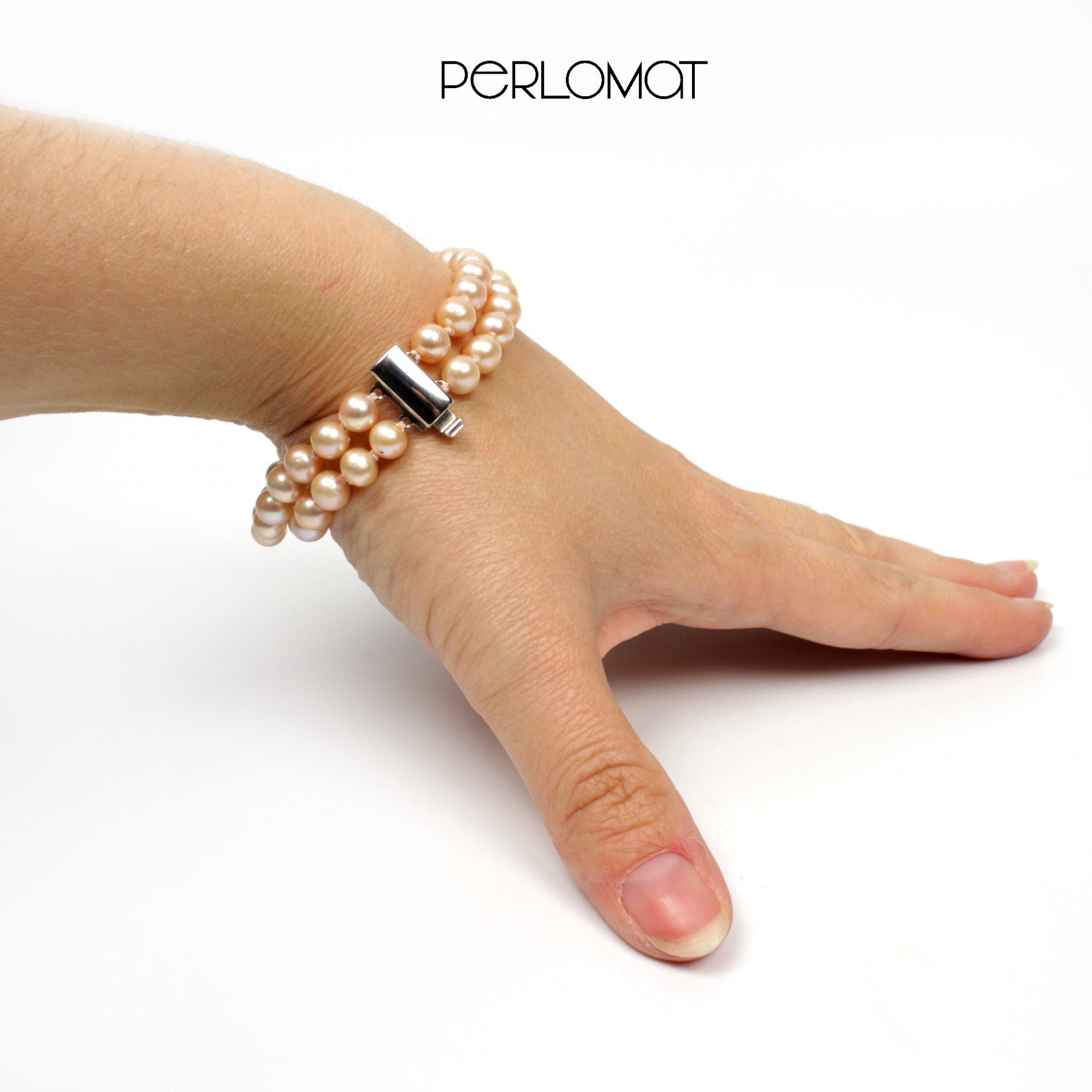 Dvouřadý perlový náramek je vyroben ze sladkovodních perel o velikosti 5-6 mm. Délka náramku je 18 cm. Délka je měřena včetně uzávěru. Perly jsou téměř kulaté, hladké s drobnými nedokonalostmi a sametovým leskem. Náramek je uzlíkovaný na hedvábí. Zapínání je rhodiované z pravého stříbra, značeno ryzostní značkou 925.
