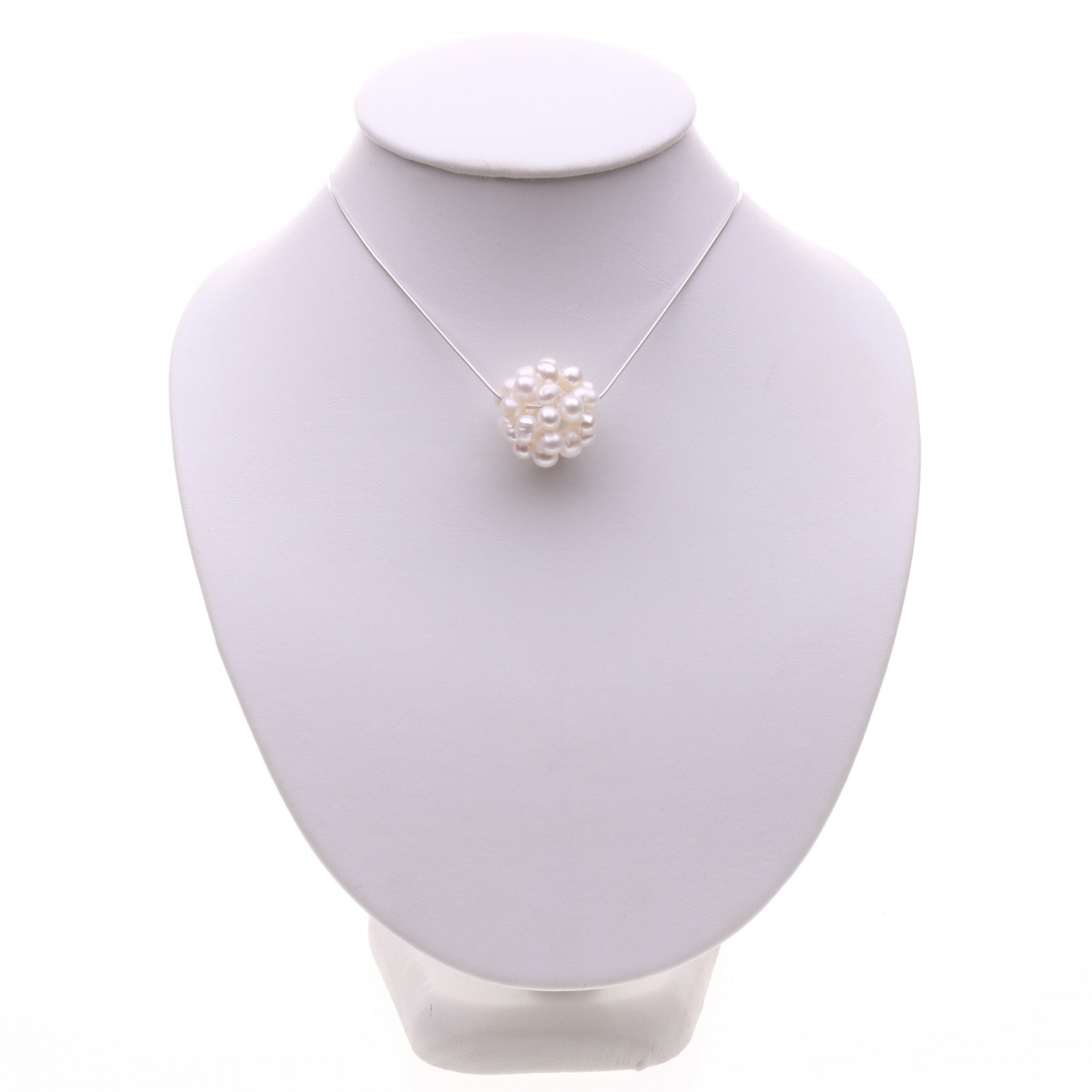 Jemný perlový stříbrný přívěsek s balónkem ze sladkovodních perel. Perlový balónek je velký 2cm, je pletený na čirém vlasci a je zavěšený na stříbrném řetízku. Jednotlivé perly jsou oválného tvaru, tzv. rýžové s drobnými nedokonalostmi a přirozeným rýhováním, jsou velké cca 3-4 x 5-6 mm. Perly mají decentní sametový lesk. K přívěsku patří také stříbrný řetízek - hladký, délka 45 cm.