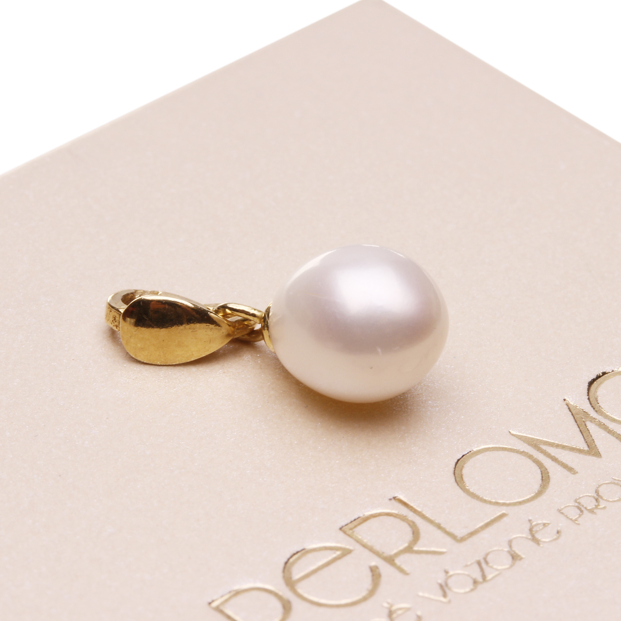 Elegantní perlový přívěsek s perlou ve tvaru kapky je osazen v oušku ze zlaceného stříbra ryzosti 925/1000. Povrch perly je hladký s krásným hedvábným leskem. Zlacení je provedeno 18 karátovým žlutým zlatem. Velikost perly je 9x11 mm. Tvar ouška, ve kterém je zavěšená perla, se může lehce měnit dle aktuálních dostupných zásob. Celková délka přívěsku je 2 cm a orientační hmotnost šperku je 1,5 gramu. Šperk obdržíte v dárkovém balení společně s naším certifikátem.
