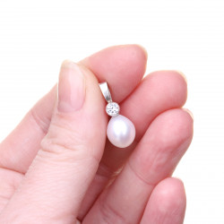 Perlový přívěsek s čirým zirkonem a kapkovitou sladkovodní perlou jakosti AAA o velikosti 9,5 mm. Montáž přívěsku je vyrobena ze stříbra ryzosti 925 / 1000 s rhodiovaným povrchem.
