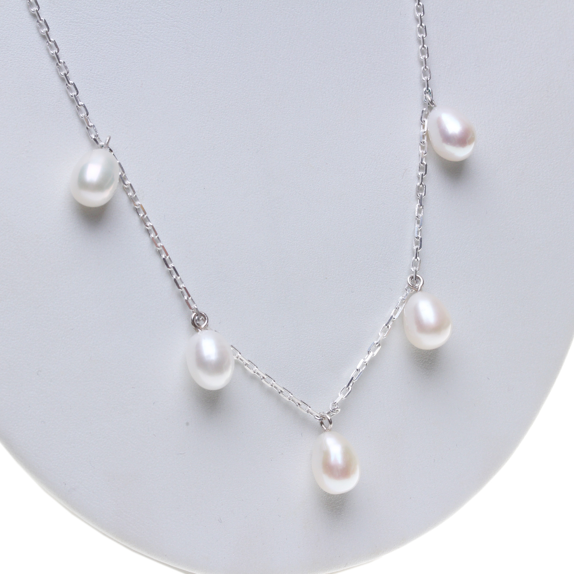 Perlový stříbrný náhrdelník tvoří pět jemných oválných perel na stříbrném řetízku. Perly jsou velké přibližně 7-9 mm, jsou polovrtané. Každá perla je lepená na kaplík s trnem do stříbrného lůžka. Řetízek z kulatých oček je dlouhý 42 cm. Orientační hmotnost šperku je 4,6 gramu. Šperk je vhodný pro každodenní nošení i k večerním šatům.