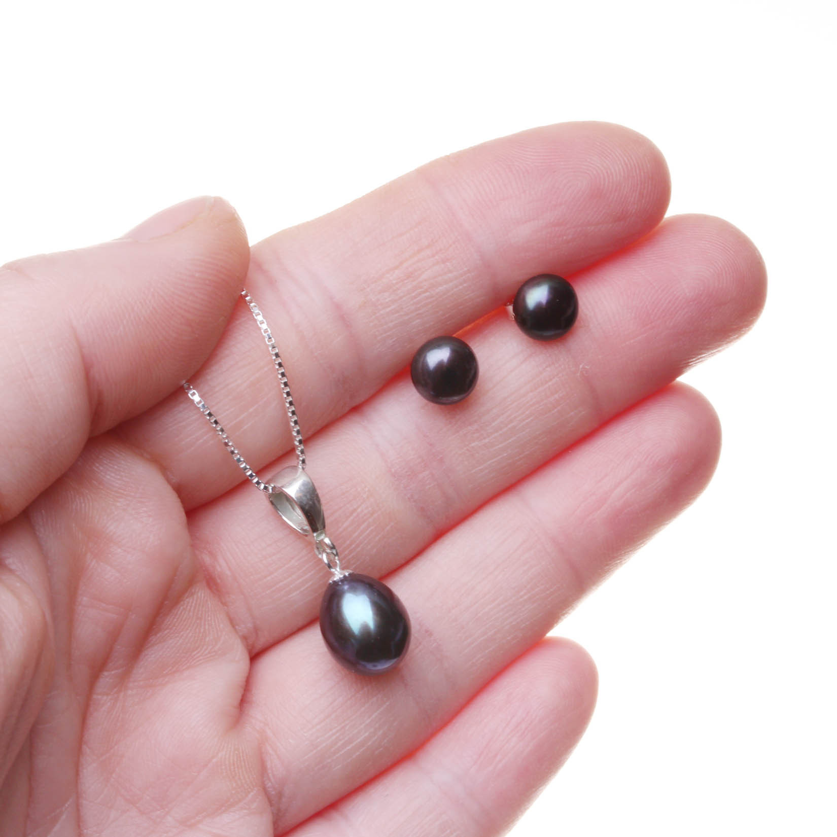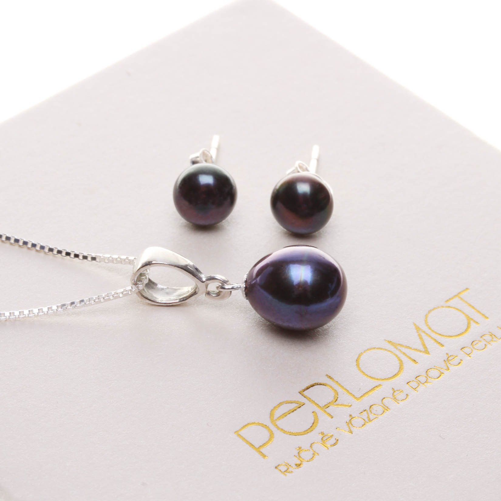 Perlová souprava obsahuje jemné perlové náušnice a stříbrný řetízek s přívěskem s jednou perlou. Šperky jsou vyrobeny ze sladkovodních perel a stříbra. Perličky v náušnicích o vel 5-6 mm jsou pěkně souměrné, kulaté a zploštělé, tzv. button perly s jemným sametovým leskem. V přívěsku je osazena jedna podlouhlá kroužkovaná celovrtaná perla o vel 10-11 mm. Celý přívěsek měří v 2,5 cm. Všechny kovové komponenty jsou vyrobeny z pravého stříbra - Ag 925. Řetízek je součástí soupravy a měří 45 cm.