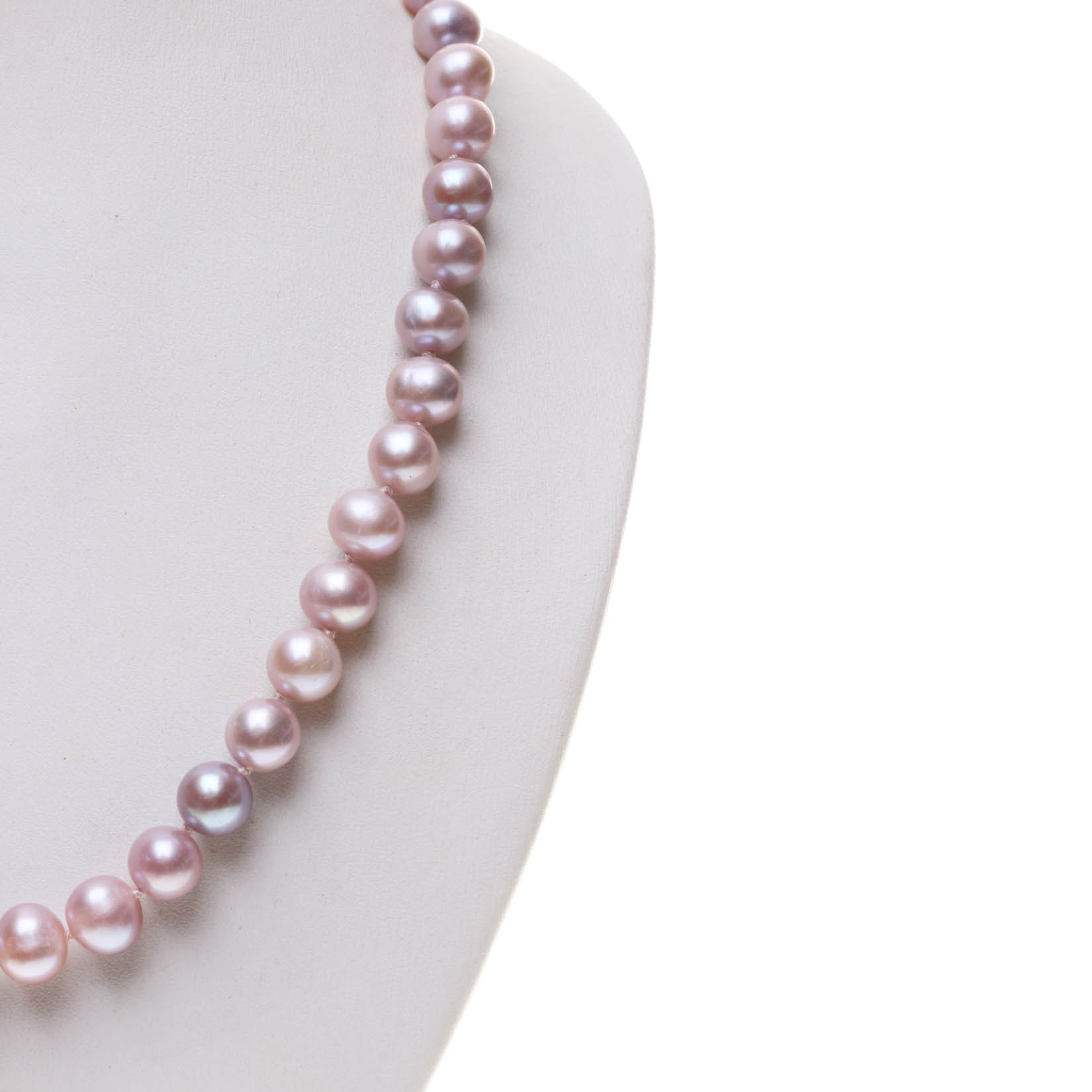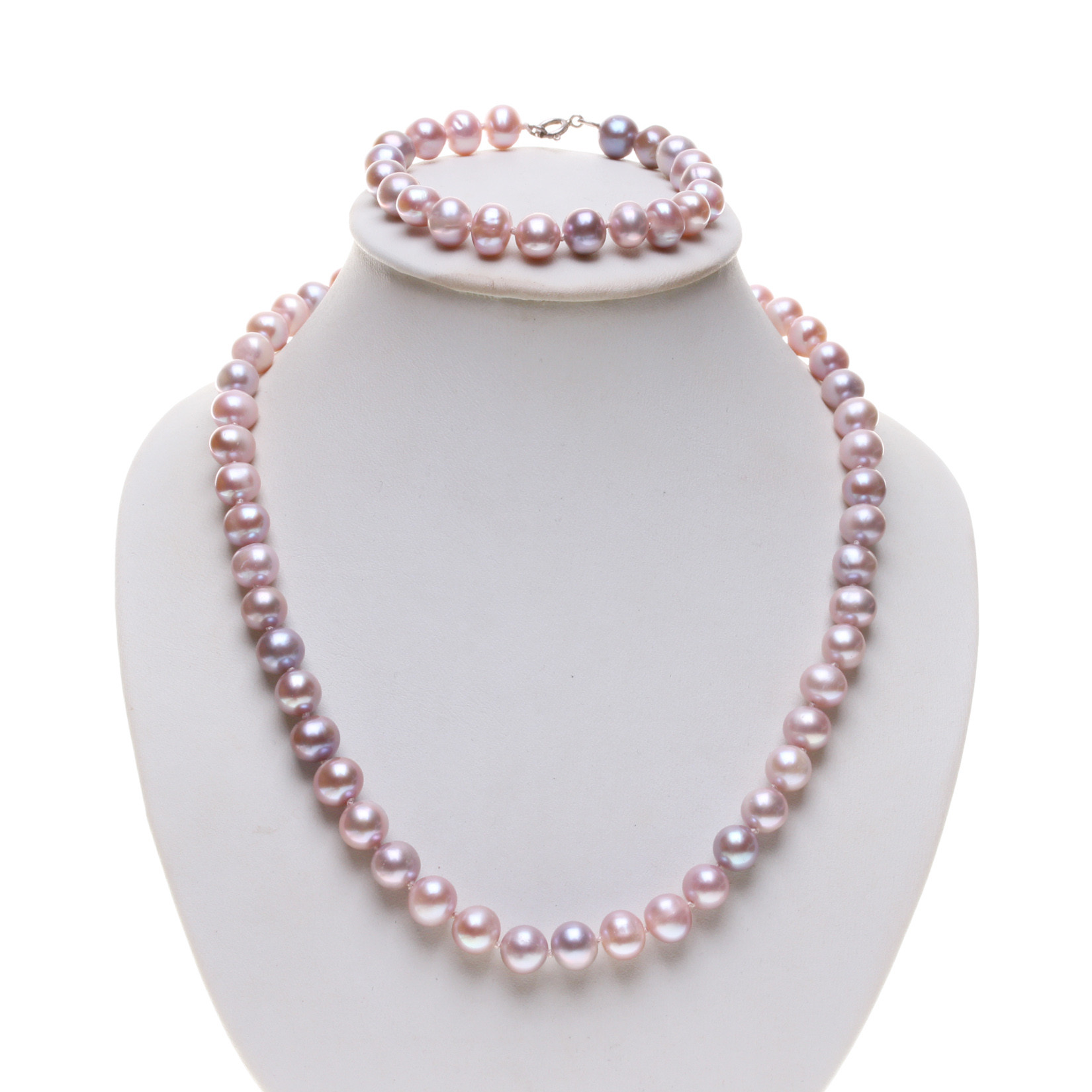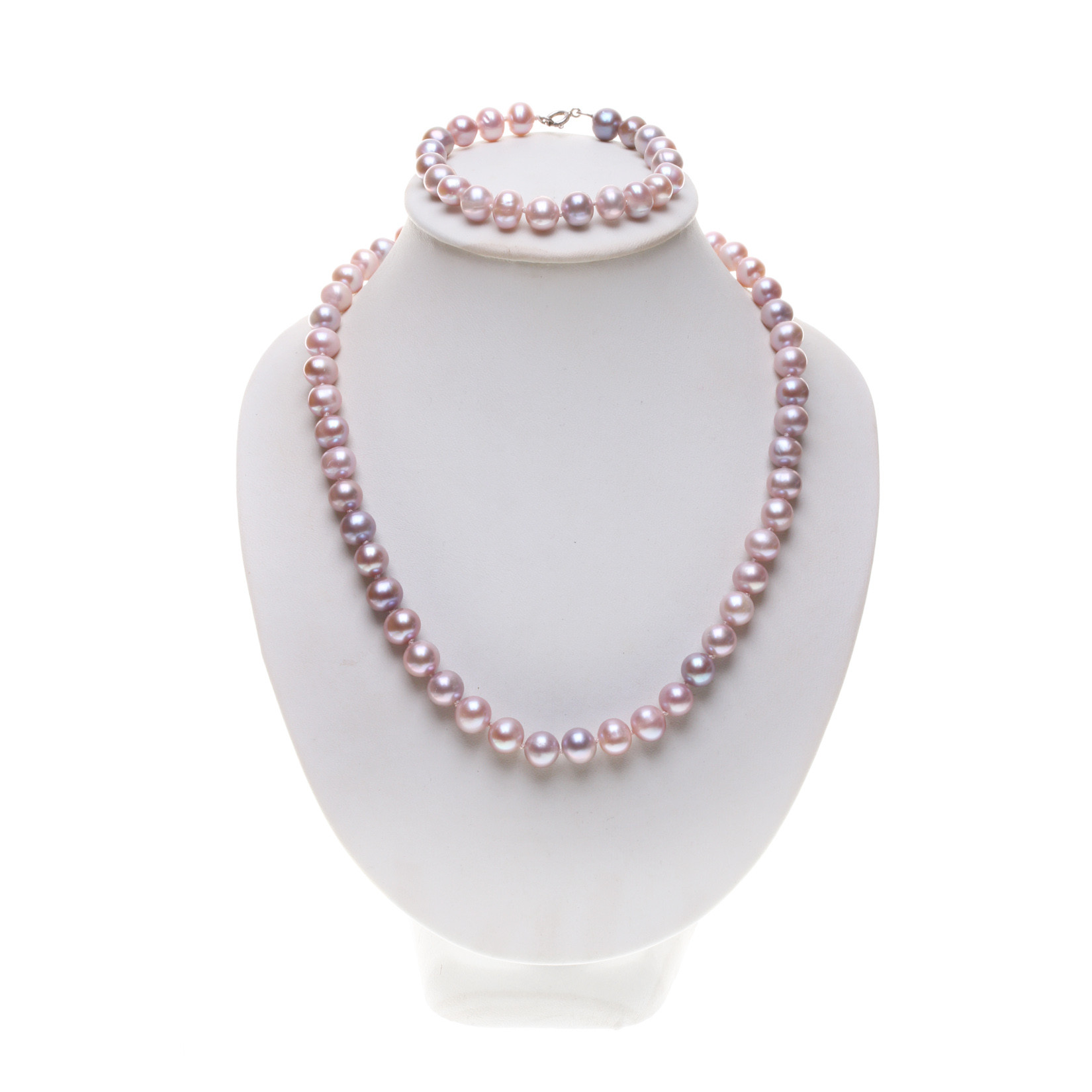 Perlová souprava je vyrobena ze sladkovodních perel o velikosti 8x9 mm. Barvy perel v soupravě hrají barevnou melodii v krásných tónech lila. Délka náhrdelníku je 41 cm. Délka je měřena v rozepnutém narovnaném stavu včetně uzávěru. Délka náramku je 18 cm. Perly jsou elipsovité, hladké vzácně s drobnými nedokonalostmi a s vysokým leskem. Souprava je uzlíkovaná na dvojitém růžovém hedvábí, perly jsou oddělené uzlíky jedna od druhé. Zapínání je z rhodiovaného stříbra.