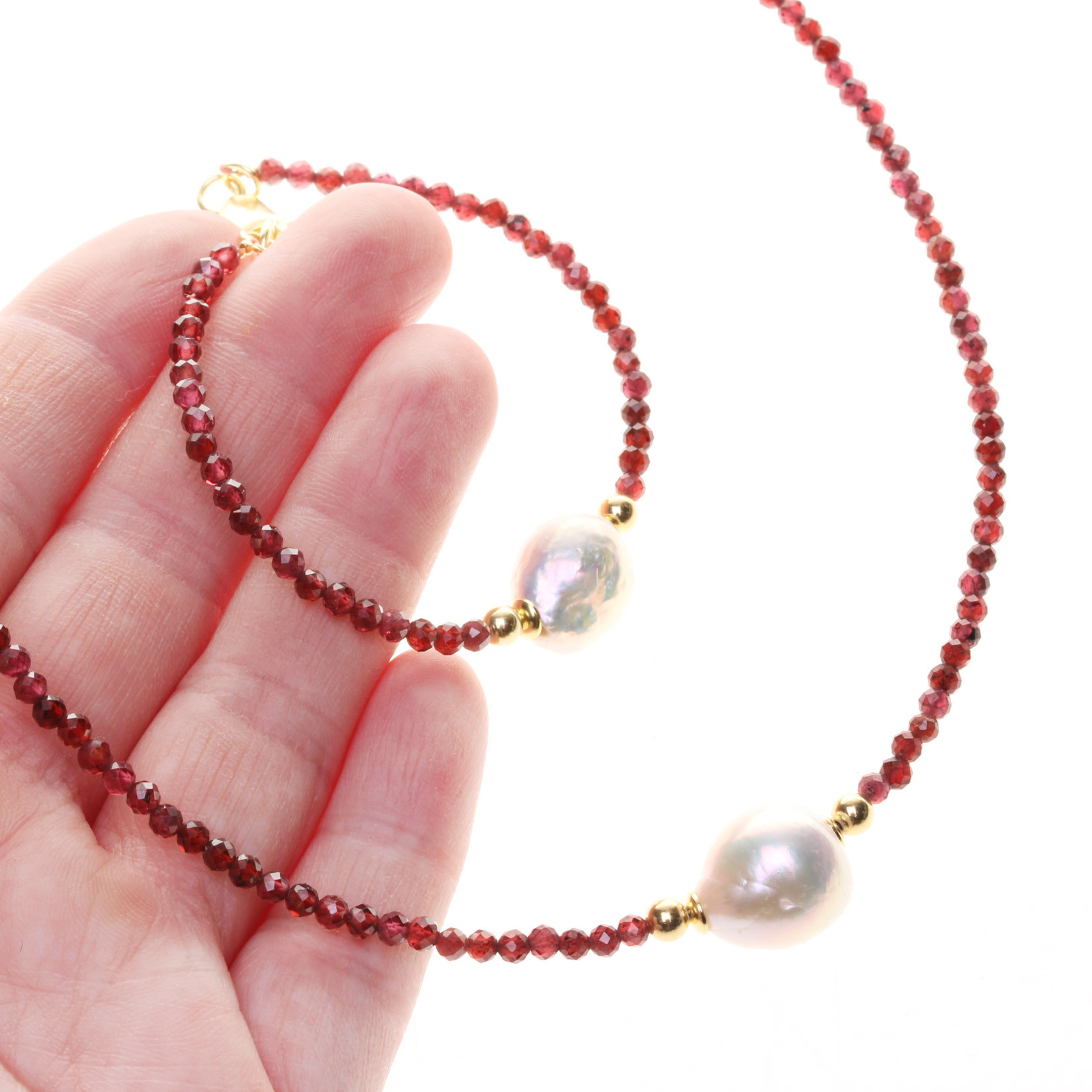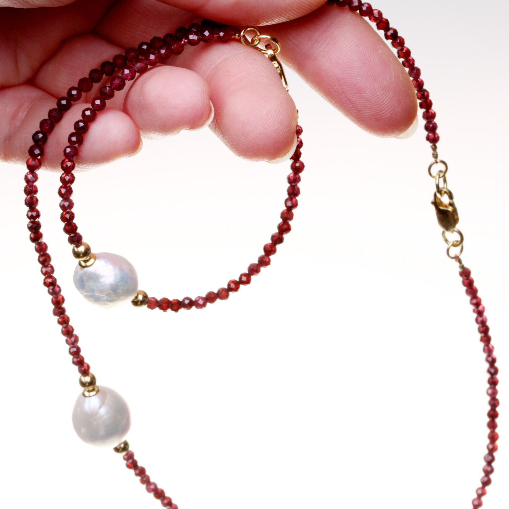Granát v hlubokém vínovém odstínu dodává soupravě výraz a energii, zatímco perly Kasumi vnášejí do šperků jemnost a osobitý charakter. Souprava se výborně hodí pro významné příležitosti, slavnostní události i jako luxusní dárek. Každý kus této soupravy vznikl v naší rodinné dílně. Kovové komponenty jsou ze stříbra ryzosti 925/1000, zlaceno 18K žlutým zlatem. Návlek je proveden na ocelovém lanku.