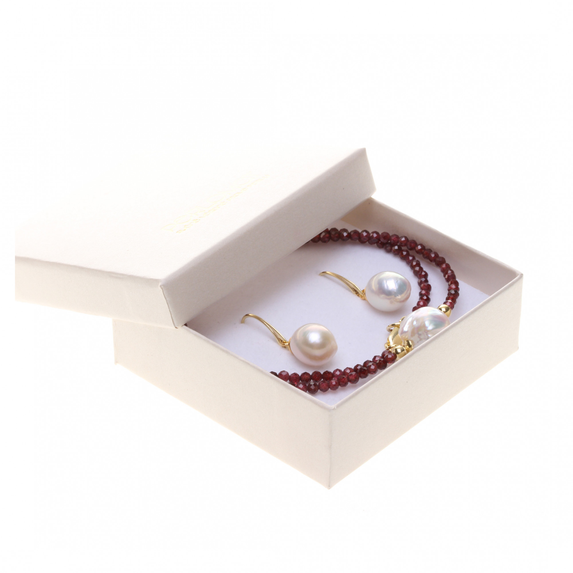 Granát v hlubokém vínovém odstínu dodává soupravě výraz a energii, zatímco perly Kasumi vnášejí do šperků jemnost a osobitý charakter. Souprava se výborně hodí pro významné příležitosti, slavnostní události i jako luxusní dárek. Každý kus této soupravy vznikl v naší rodinné dílně.