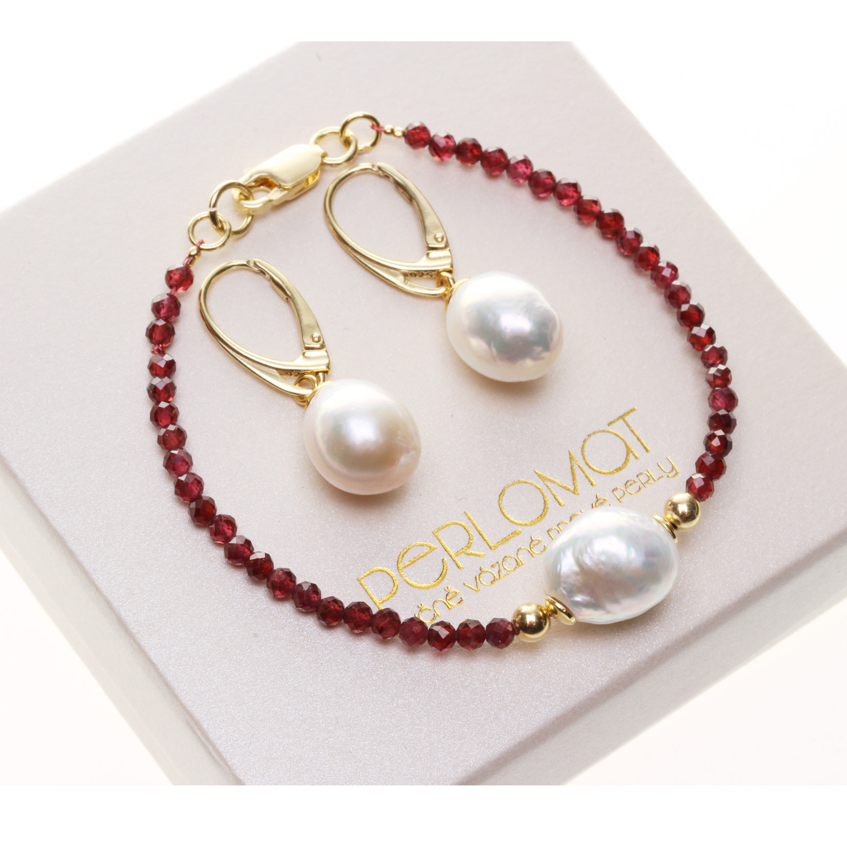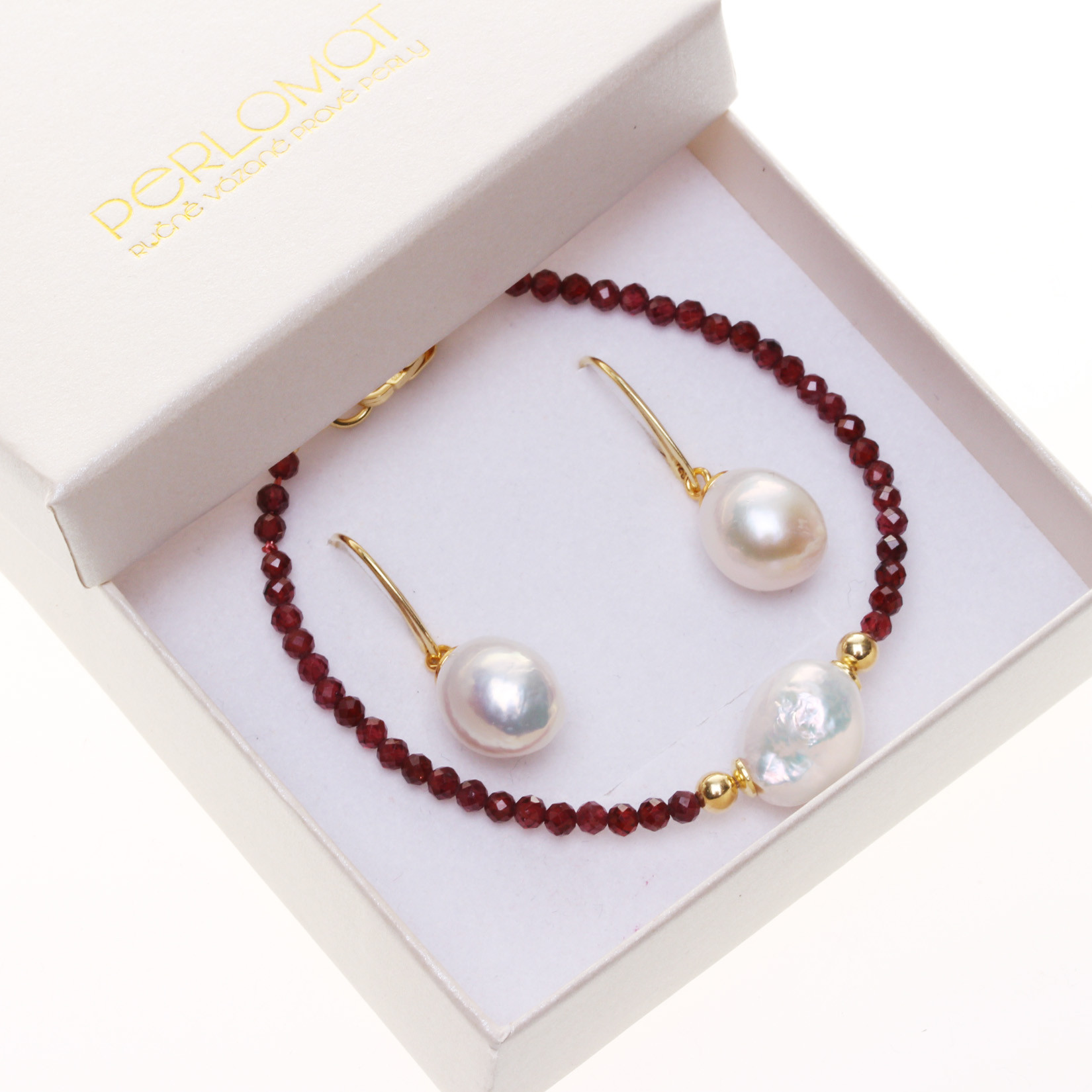 Granát v hlubokém vínovém odstínu dodává soupravě výraz a energii, zatímco perly Kasumi vnášejí do šperků jemnost a osobitý charakter. Souprava se výborně hodí pro významné příležitosti, slavnostní události i jako luxusní dárek. Každý kus této soupravy vznikl v naší rodinné dílně.