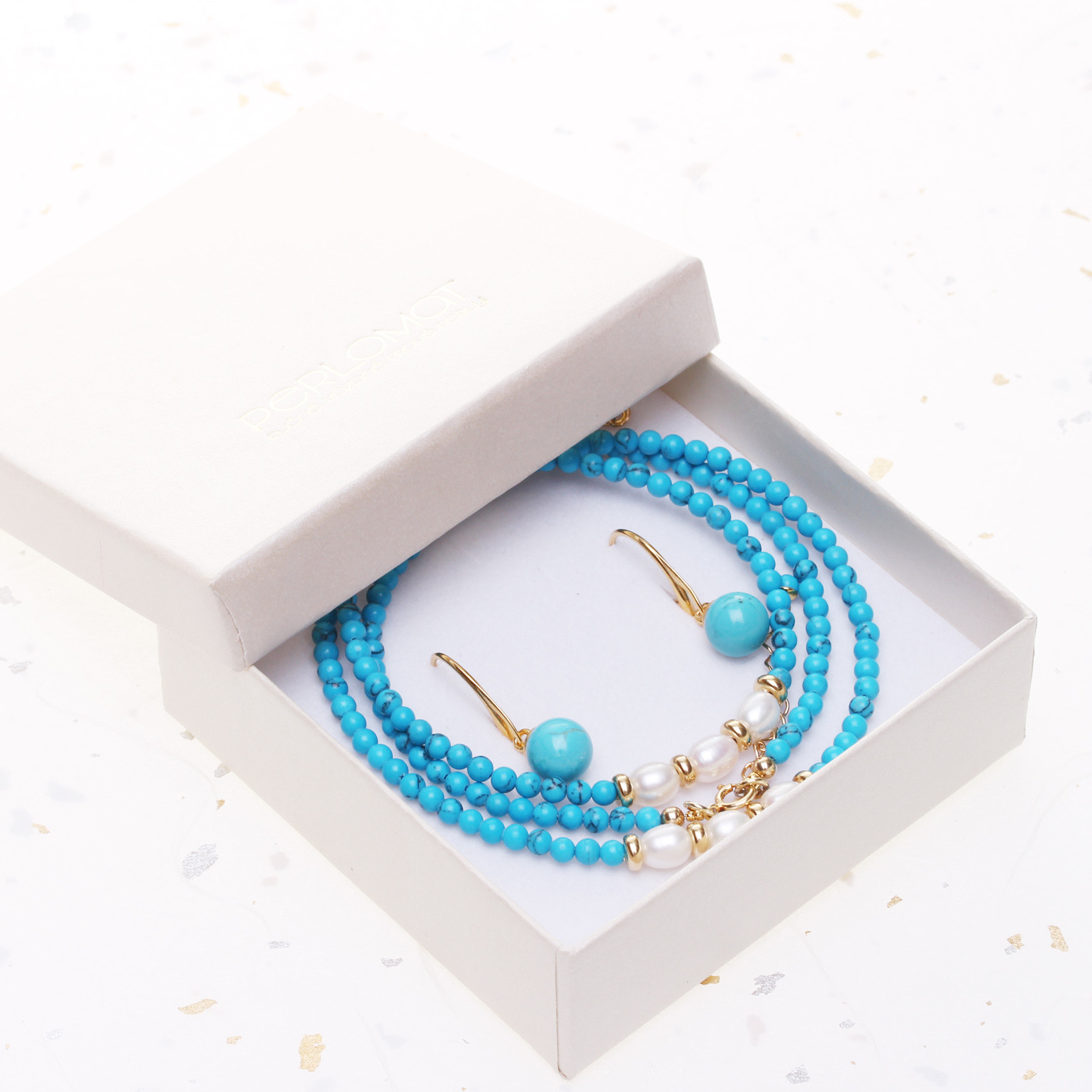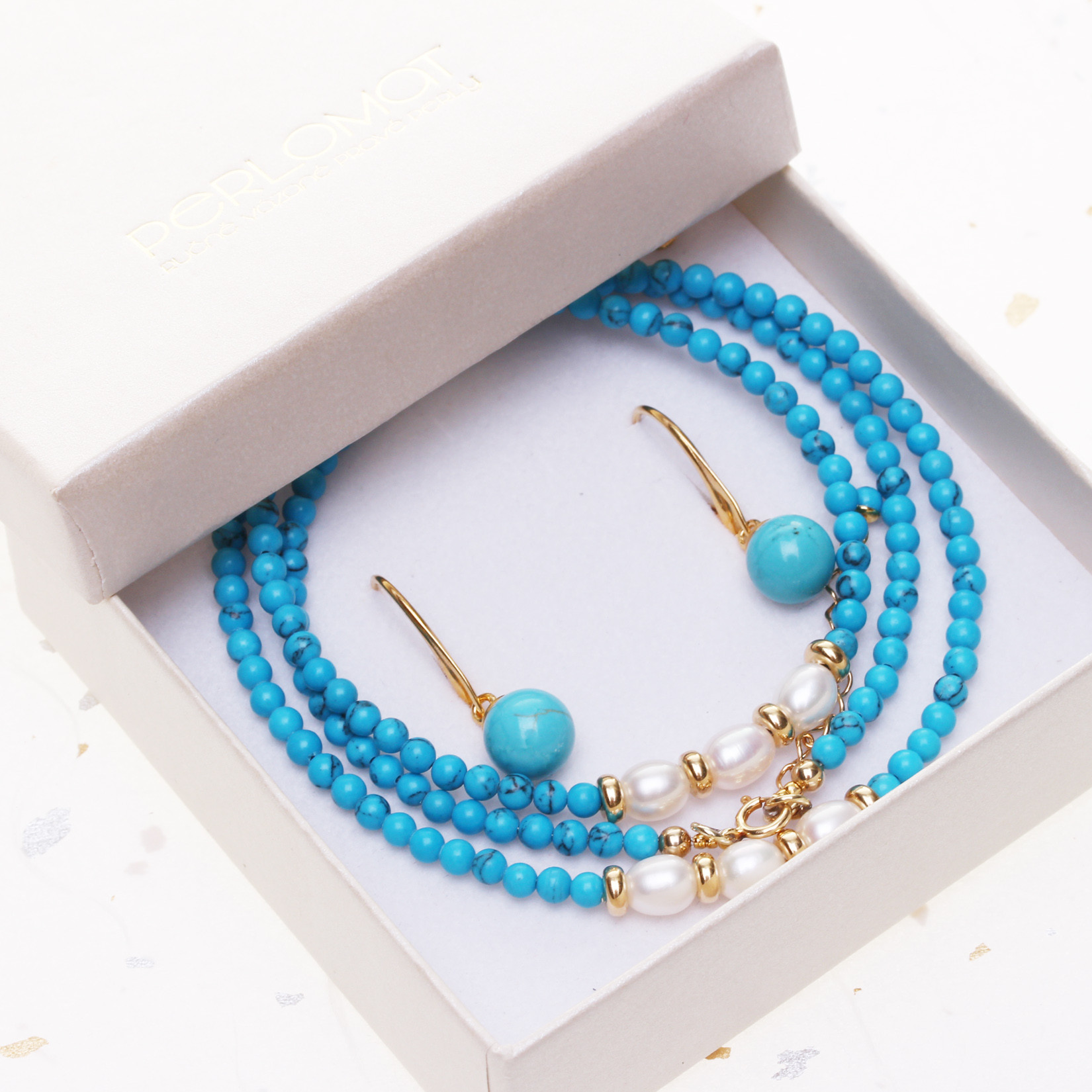 Tato jemná a svěží souprava se skládá z náušnic, náhrdelníku a náramku, ručně sestavených z drobných korálků rekonstruovaného tyrkysu (3–4 mm) a tří sladkovodních perel, které zdobí střed náramku i náhrdelníku.