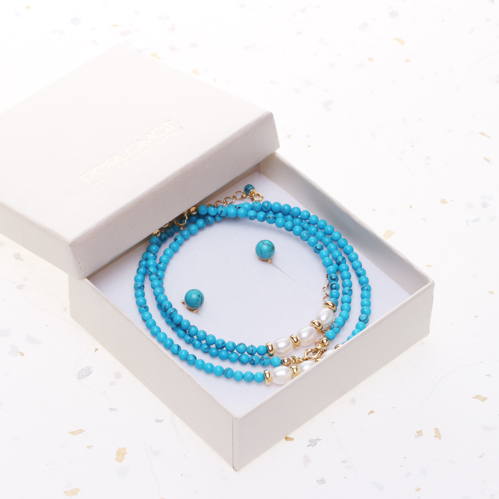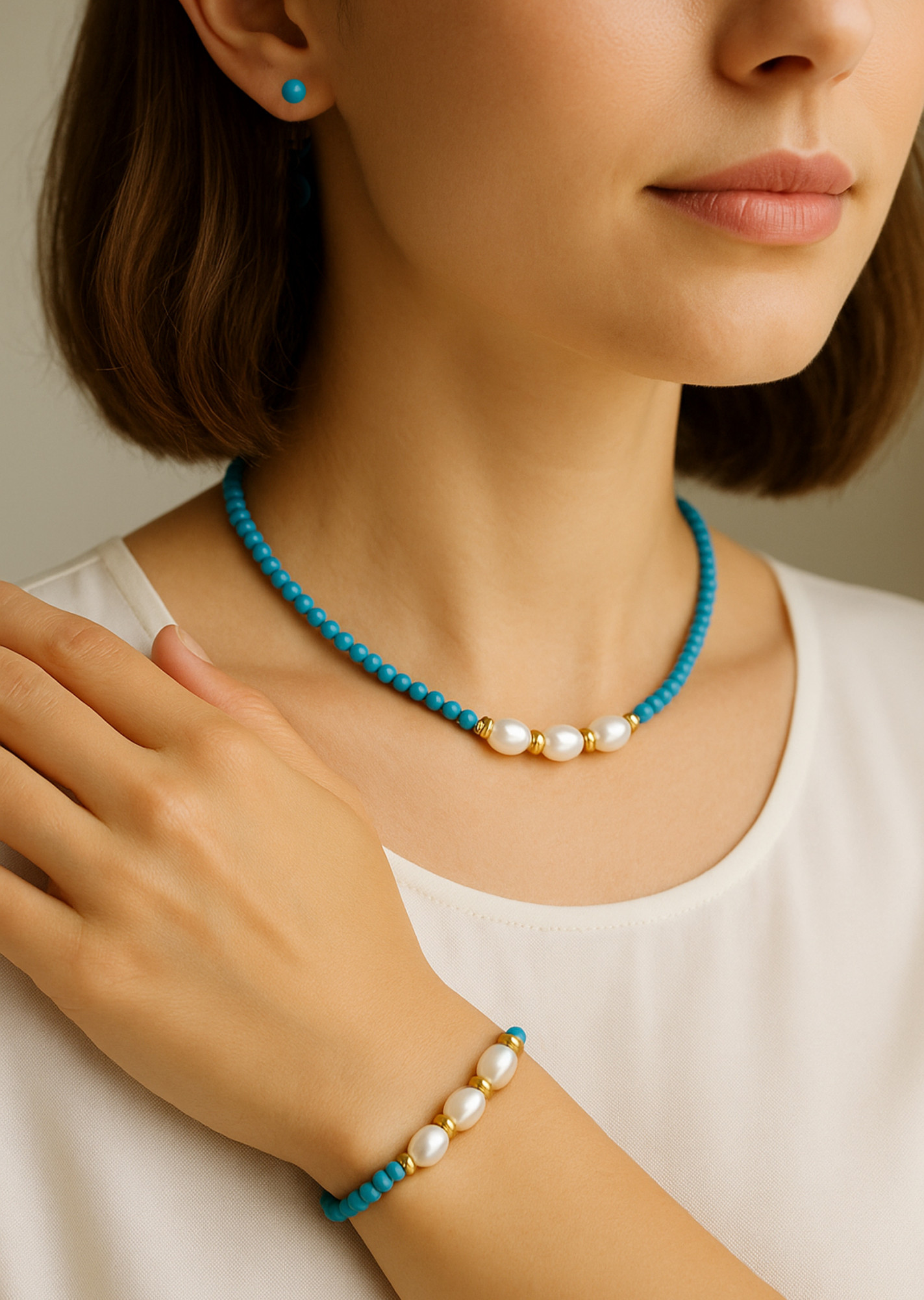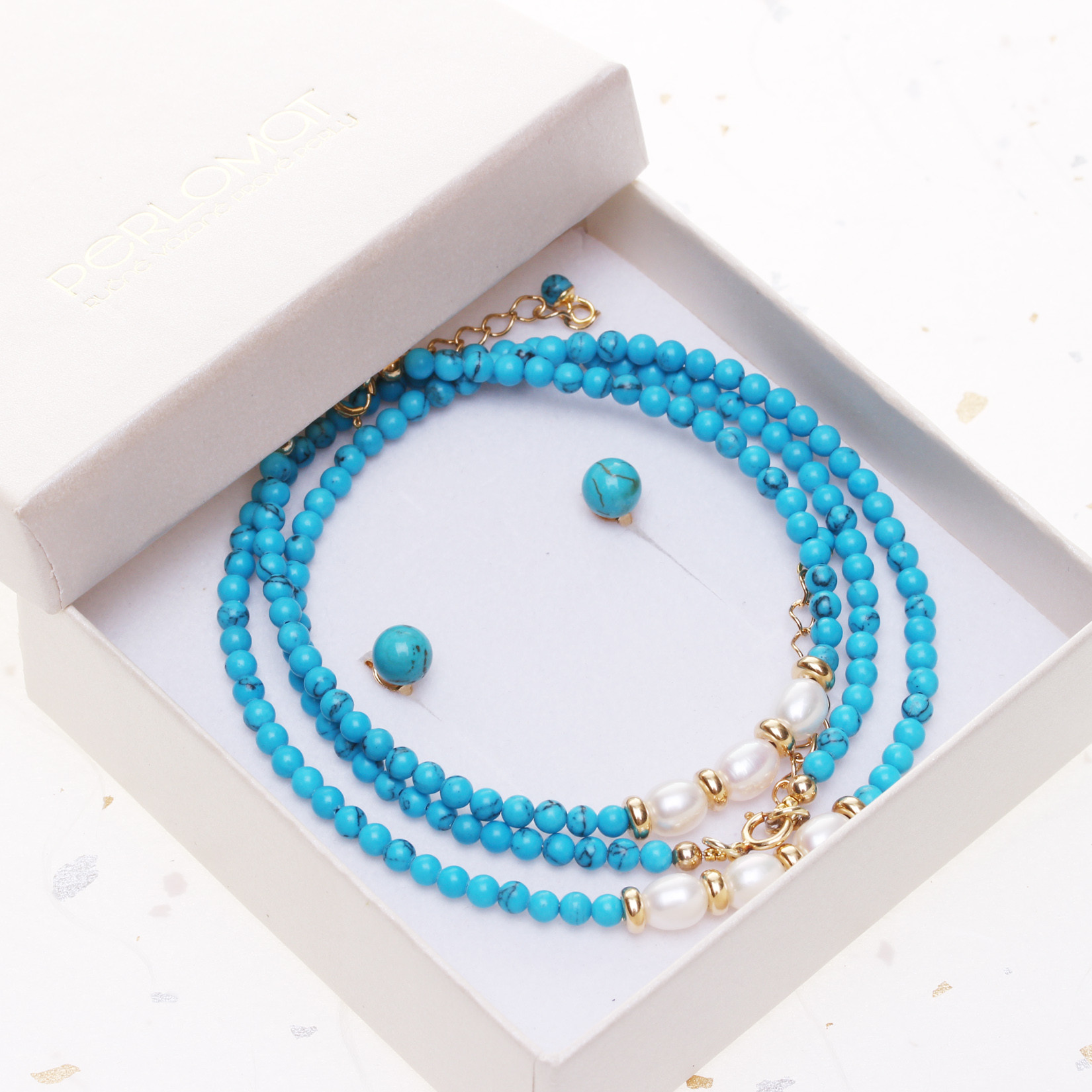 Tato jemná a svěží souprava se skládá z náušnic, náhrdelníku a náramku, ručně sestavených z drobných korálků rekonstruovaného tyrkysu (3–4 mm) a tří sladkovodních perel, které zdobí střed náramku i náhrdelníku.