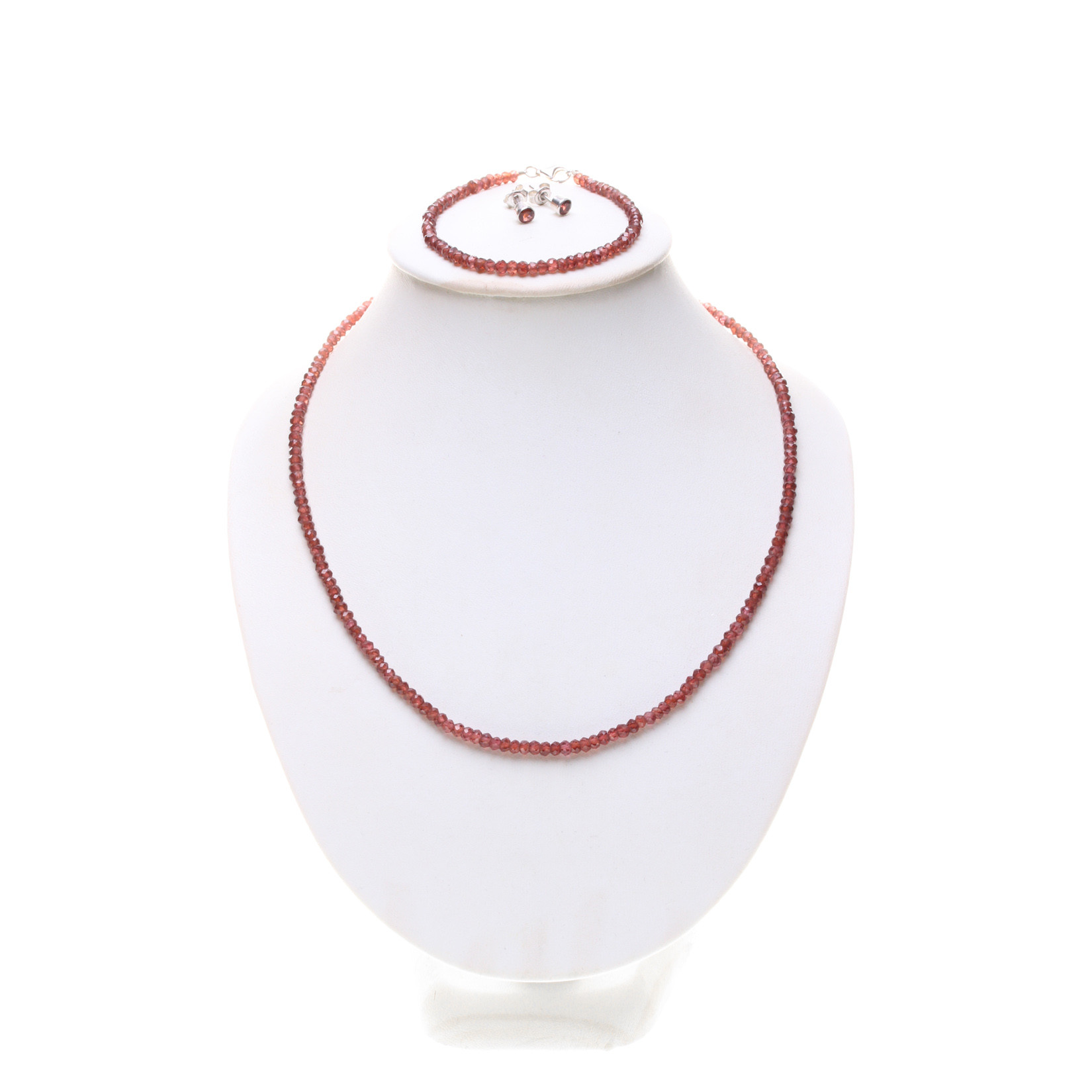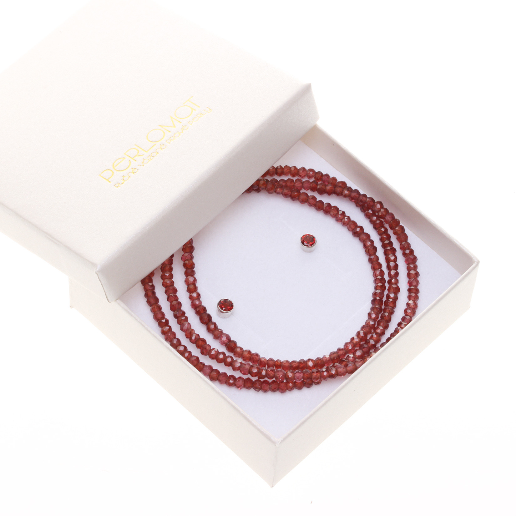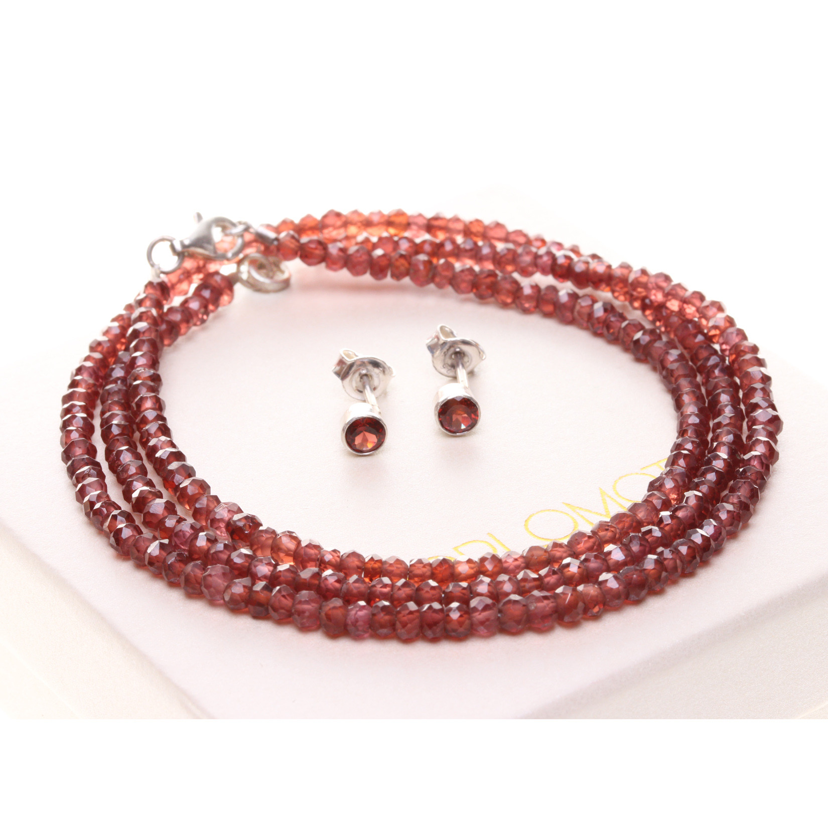 Jemnou soupravu z přírodních fasetovaných granátů - almandinů tvoří elegantní náušnice typu puzetky s fasetovanými granáty, náhrdelník o délce 41–45 cm a náramek o délce 17–20 cm (délku lze zvolit v parametrech produktu). Granátové kameny-rondelky použité v náhrdelníku a náramku jsou transparentní a mají průměr 3,2–3,5 mm. Šňůry jsou navlečeny na odolném ocelovém lanku, které dobře drží tvar. Kameny mají sytou vínovou barvu a díky fasetování se nádherně třpytí.