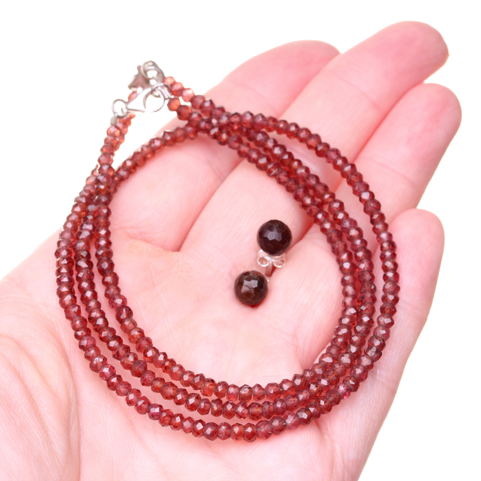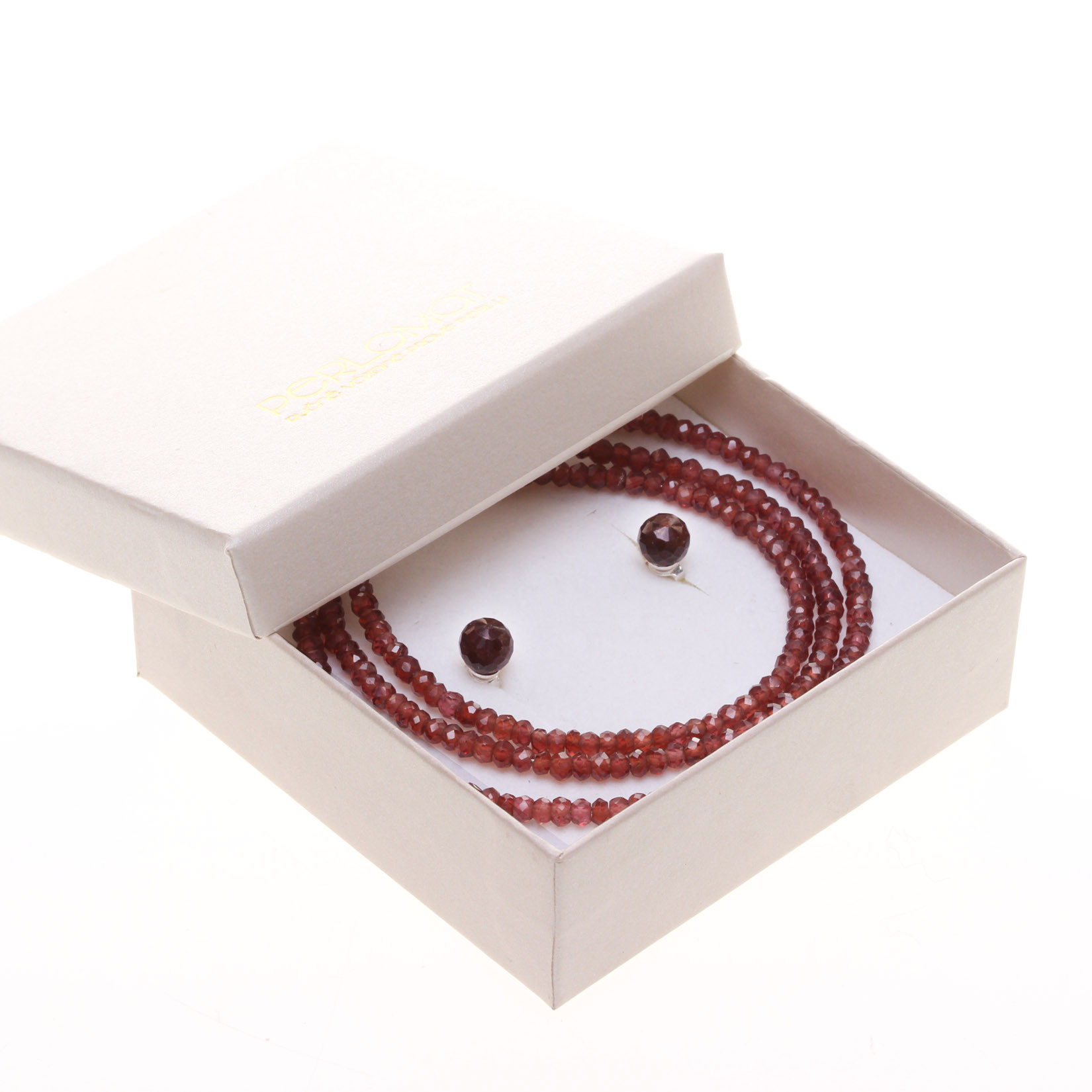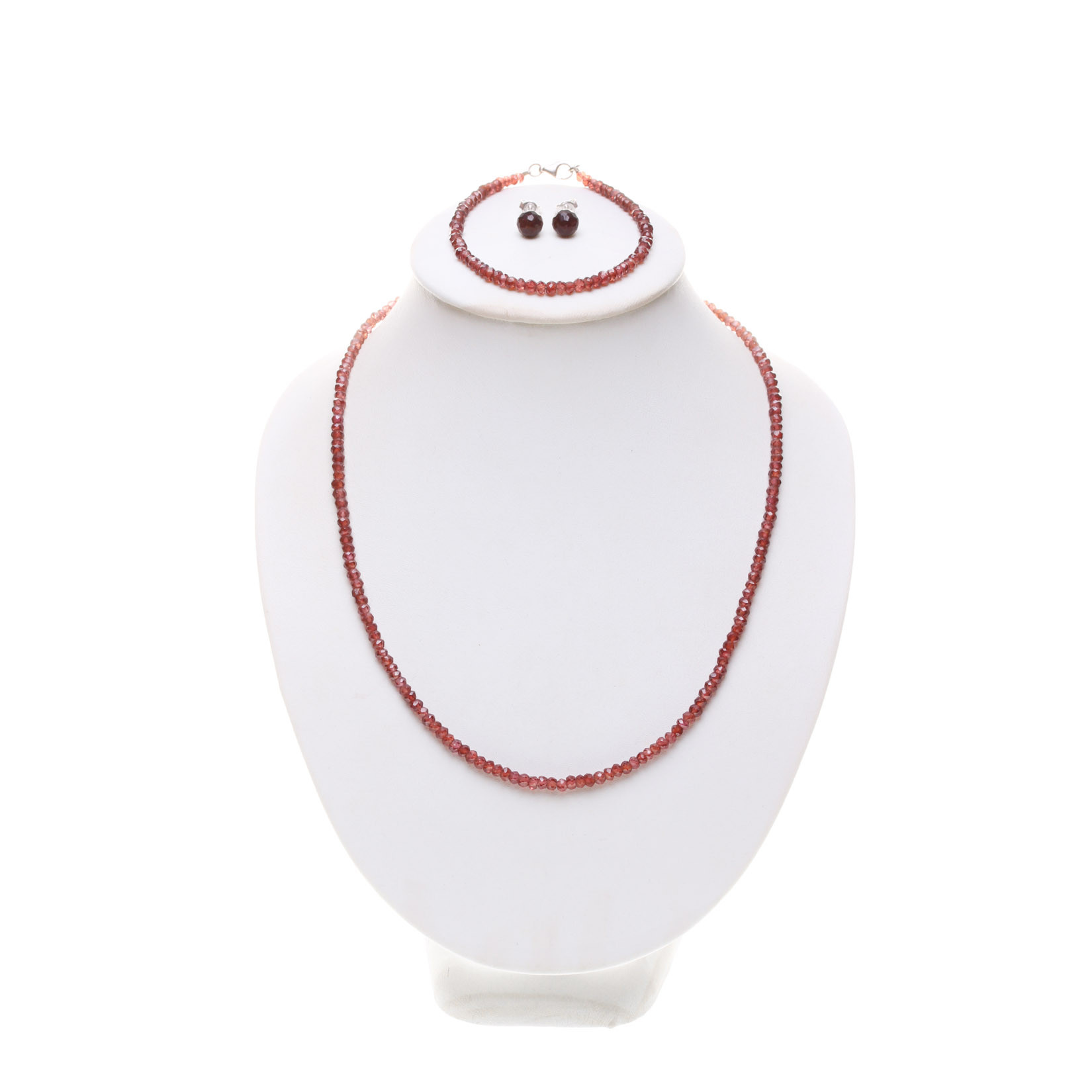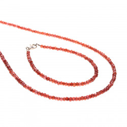 Jemnou soupravu z přírodních fasetovaných granátů - almandinů tvoří náušnice typu puzetky, náhrdelník o délce 41–45 cm a náramek o délce 17–20 cm (délku lze zvolit v parametrech produktu). Granátové kameny-rondelky použité v náhrdelníku a náramku jsou transparentní a mají průměr 3,2–3,5 mm, v náušnicích jsou osazeny fasetované kuličky jsou tmavě vínové-opakní o průměru 6,5 mm.