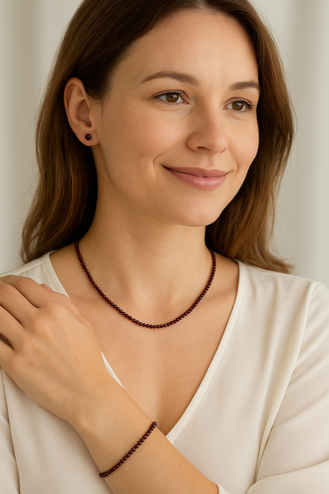 Šňůry jsou navlečeny na odolném ocelovém lanku, které dobře drží tvar. Kameny mají sytou vínovou barvu a díky fasetování se nádherně třpytí. Celkový dojem ze sady je luxusní, ale přitom jemný a decentní.