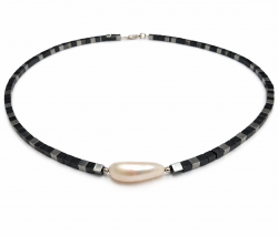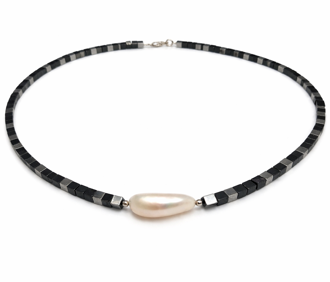 Tento minimalistický šperk kombinuje kostičky hematitu s barokní perlou typu kasumi. Kontrast tmavých tónů a jemného perleťového lesku vytváří vyvážený a sebevědomý celek. Kostičky hematitu střídají stříbrnou a černou a mají průměr 4 mm.