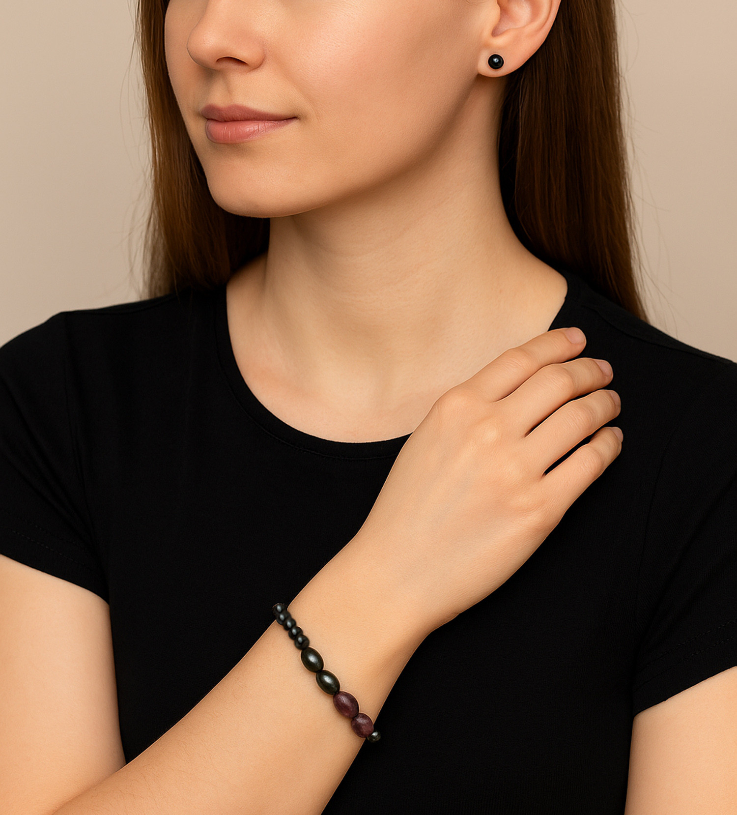 Souprava obsahuje náramek o délce 17-21 cm a decentní puzetové náušnice osazené 6mm kuličkami hematitu. Vše je doplněno kvalitními komponenty ze stříbra Ag 925. Náramek je navlečen na pevném ocelovém lanku, které zajišťuje dlouhou životnost.