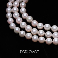 Poptávaná perlová souprava tvoří kompletní perlovou sadu skládající se z perlového náhrdelníku a náramku doplněných perlovými visacími náušnicemi. Náhrdelník i náramek budou uvázány dle přání zákazníka v délce 52 a 19 cm. Délky šperků jsou měřeny v rozepnutém narovnaném stavu včetně uzávěrů. Perly budou navlečeny na přírodním bílém hedvábí a uzlíkovány klasickou perlovou vazbou. Uzávěry i náušnice jsou vyrobeny z rhodiovaného stříbra Ag 925/1000. Použity budou bílé japonské akoya perly o velikosti 6,1 -6,3 mm s tl. perleti cca 0,7 mm. Perly mají téměř ideálně kulatý tvar, hladký povrch jen místy s drobnými nedokonalostmi, odlesky do růžovo-zlaté a vysoký hedvábný lesk.