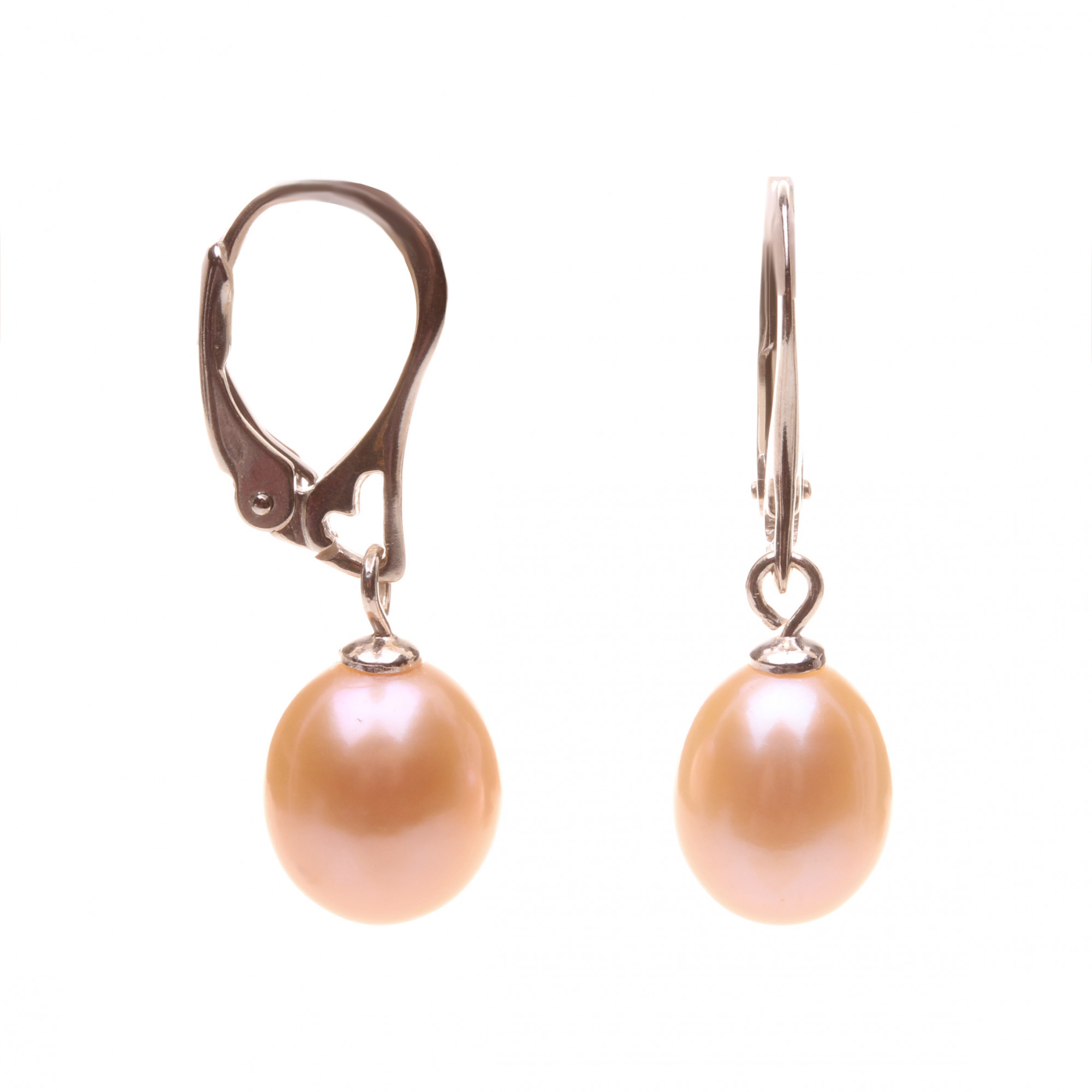 Exkluzivní perlové visací náušnice s párem sladkovodních velkých růžových perel. Perly jsou souměrné, kapkovité s pěkným leskem. Mechanika je provedena ze stříbra Ag 925/1000. Délka celé náušnice je 2 cm, průměr perly cca 8 x 10-11 mm. Hmotnost šperku je 3,6 gramu.